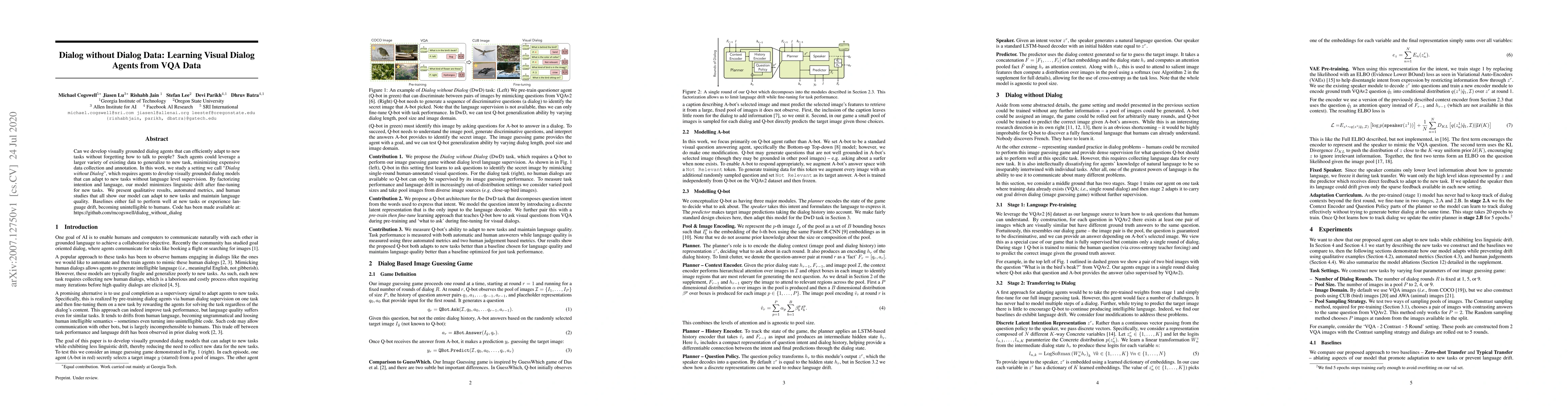 Researchers developed a model that enables visually grounded dialog agents to adapt to new tasks without language level supervision, minimizing data collection costs. The model achieved high performance with minimal linguistic drift, outperforming baselines in human studies.