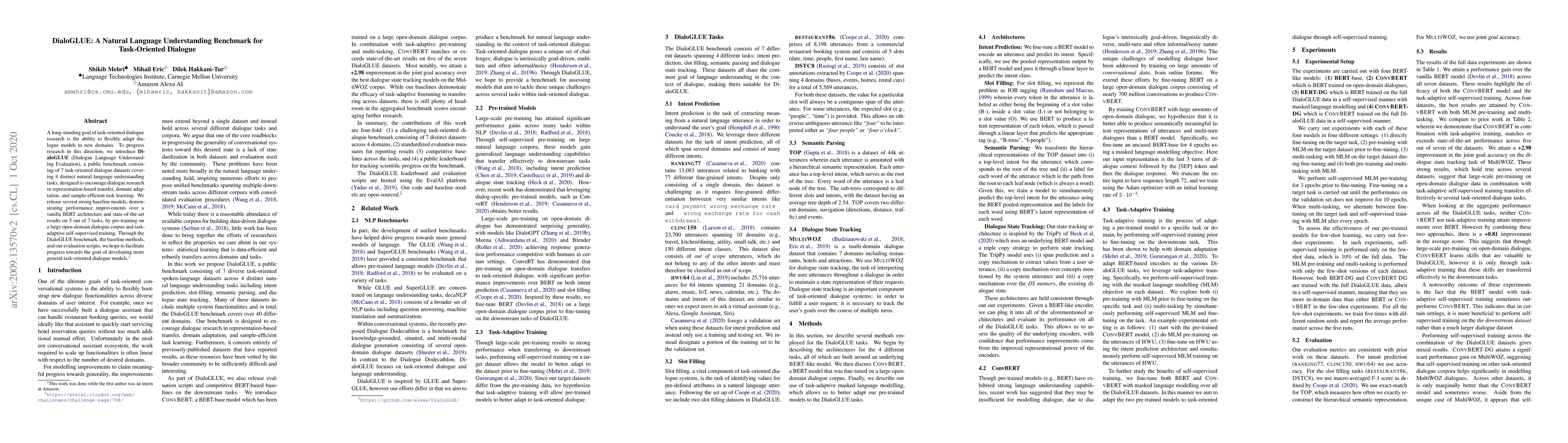 A long-standing goal of task-oriented dialogue research is the ability to flexibly adapt dialogue models to new domains. To progress research in this direction, we introduce DialoGLUE (Dialogue Language Understanding Evaluation), a public benchmark consisting of 7 task-oriented dialogue datasets covering 4 distinct natural language understanding tasks, designed to encourage dialogue research in representation-based transfer, domain adaptation, and sample-efficient task learning. We release several strong baseline models, demonstrating performance improvements over a vanilla BERT architecture and state-of-the-art results on 5 out of 7 tasks, by pre-training on a large open-domain dialogue corpus and task-adaptive self-supervised training. Through the DialoGLUE benchmark, the baseline methods, and our evaluation scripts, we hope to facilitate progress towards the goal of developing more general task-oriented dialogue models.