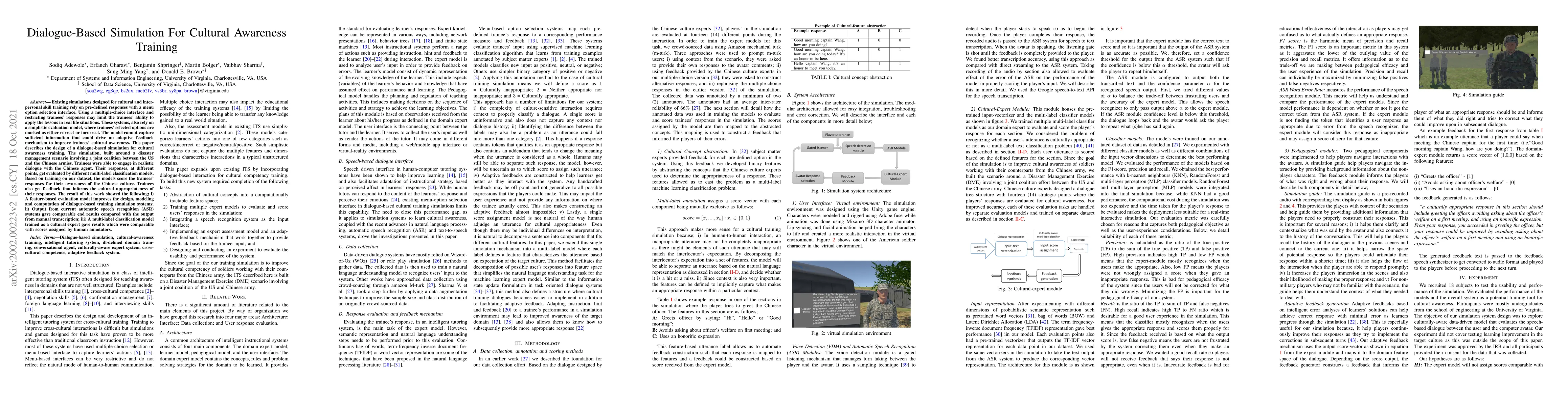 This paper introduces a dialogue-based simulation for cultural awareness training, moving beyond predefined responses to allow for more realistic interactions. The simulation uses multi-label classification models to provide adaptive feedback on trainees' cultural appropriateness, demonstrating improved evaluation models and comparable results from automatic speech recognition systems.