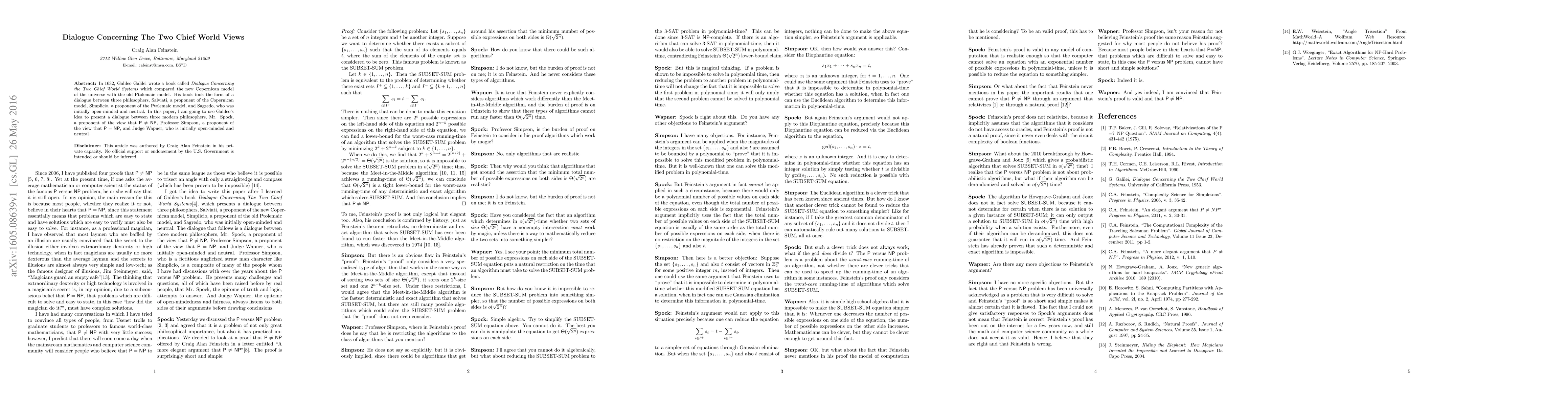 In 1632, Galileo Galilei wrote a book called \textit{Dialogue Concerning the Two Chief World Systems} which compared the new Copernican model of the universe with the old Ptolemaic model. His book took the form of a dialogue between three philosophers, Salviati, a proponent of the Copernican model, Simplicio, a proponent of the Ptolemaic model, and Sagredo, who was initially open-minded and neutral. In this paper, I am going to use Galileo's idea to present a dialogue between three modern philosophers, Mr. Spock, a proponent of the view that $\mathsf{P} \neq \mathsf{NP}$, Professor Simpson, a proponent of the view that $\mathsf{P} = \mathsf{NP}$, and Judge Wapner, who is initially open-minded and neutral.
