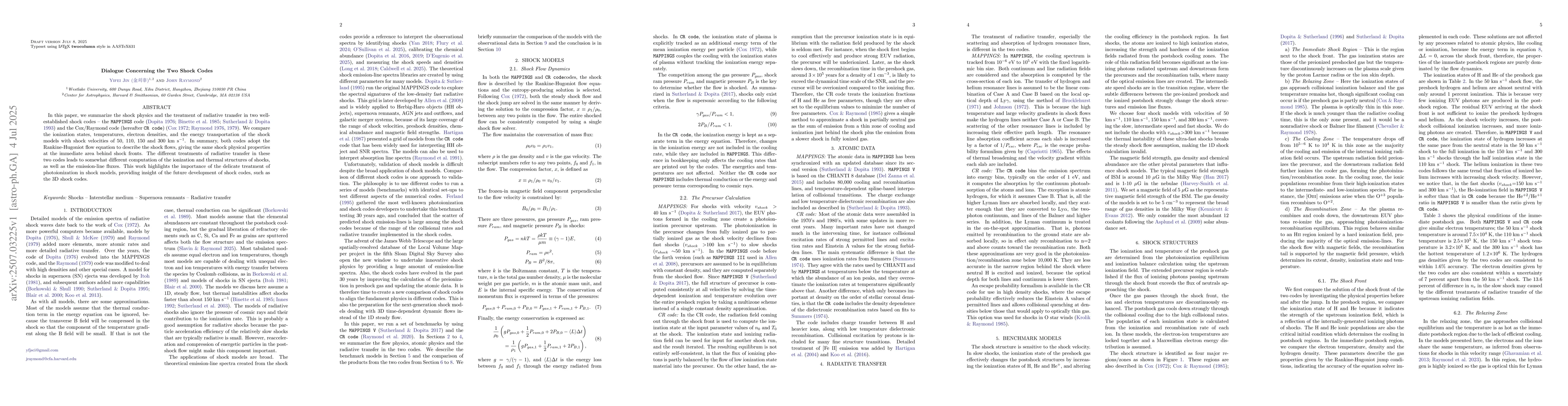 In this paper, we summarize the shock physics and the treatment of radiative transfer in two well-established shock codes -- the MAPPINGS code (Dopita1976,Binette1985,Sutherland1993) and the Cox/Raymond code (hereafter CR code) (Cox1972,Raymond1976,Raymond1979). We compare the ionization states, temperatures, electron densities, and the energy transportation of the shock models with shock velocities of 50, 110, 150 and 300 km/s. In summary, both codes adopt the Rankine-Hugoniot flow equation to describe the shock flows, giving the same shock physical properties at the immediate area behind shock fronts. The different treatments of radiative transfer in these two codes leads to somewhat different computation of the ionization and thermal structures of shocks, as well as the emission-line fluxes. This work highlights the importance of the delicate treatment of photoionization in shock models, providing insight of the future development of shock codes, such as the 3D shock codes.