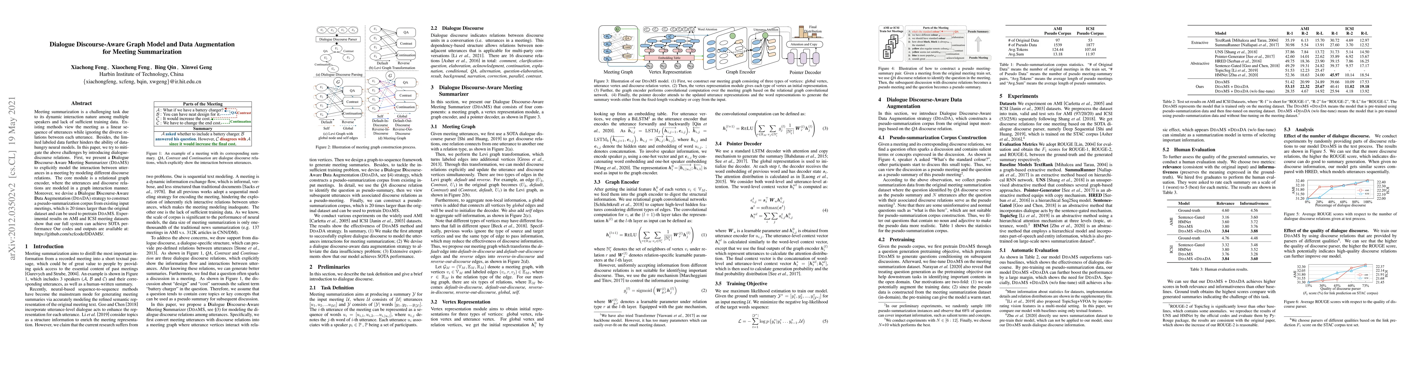 This paper introduces a Dialogue Discourse-Aware Meeting Summarizer (DDAMS) that models interaction between utterances using a relational graph encoder and a Dialogue Discourse-Aware Data Augmentation (DDADA) strategy to augment training data, achieving state-of-the-art performance on AMI and ICSI datasets. The DDADA method creates a significantly larger pseudo-summarization corpus to pretrain DDAMS.