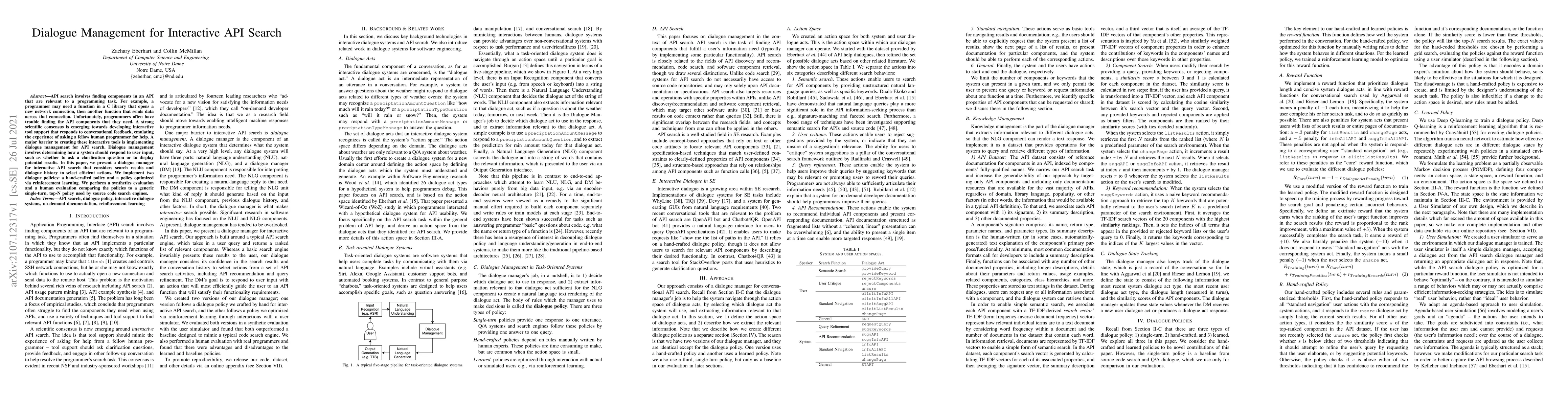 Researchers developed a dialogue manager for interactive API search that considers user input and search results to select efficient actions, outperforming generic single-turn policies in human evaluations.