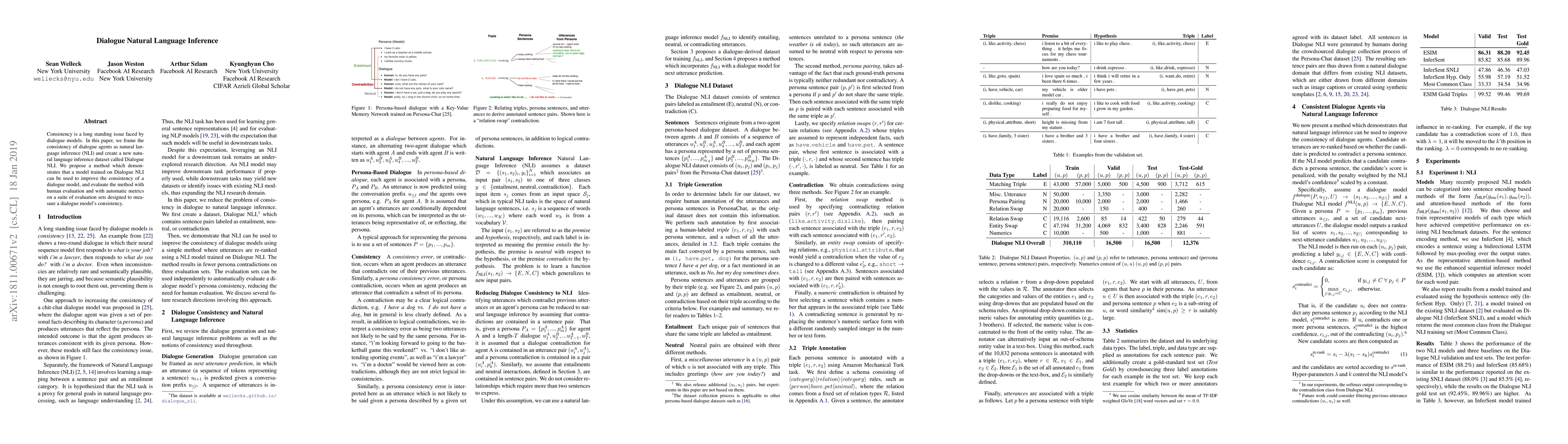This paper frames dialogue consistency as natural language inference (NLI) and introduces a new dataset, Dialogue NLI, to train models. It proposes a method that leverages this dataset to enhance dialogue model consistency, evaluated via human assessments and automatic metrics.
