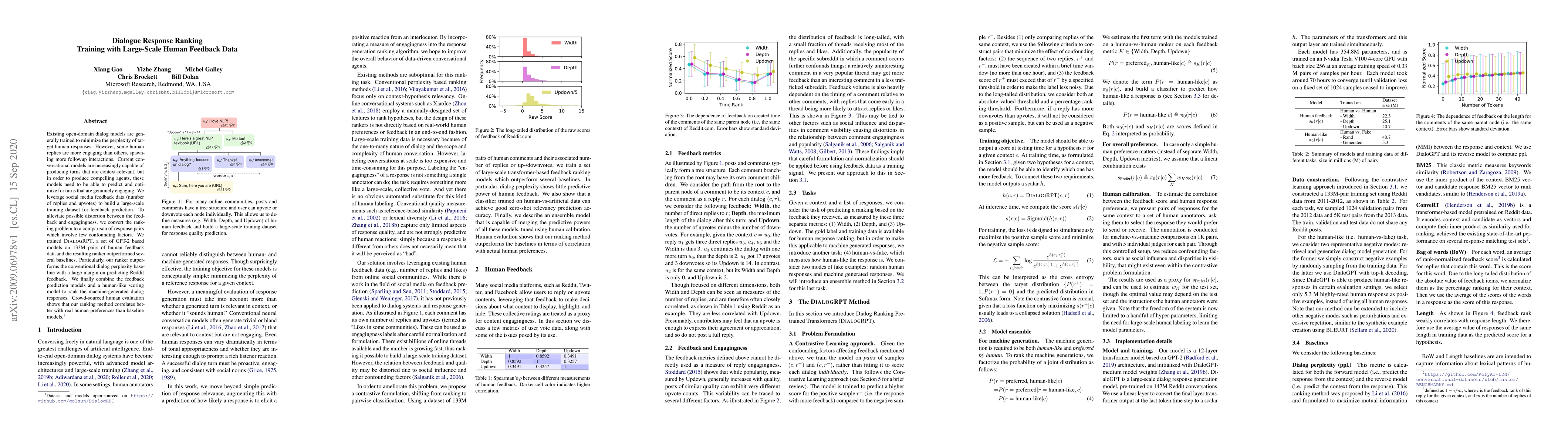 This paper presents DialogRPT, a GPT-2 based model trained on large-scale human feedback data from social media to rank dialogue responses based on engagement. The authors show that their model outperforms traditional perplexity-based baselines in predicting and generating engaging responses, as demonstrated by improved Reddit feedback prediction and crowd-sourced human evaluations.