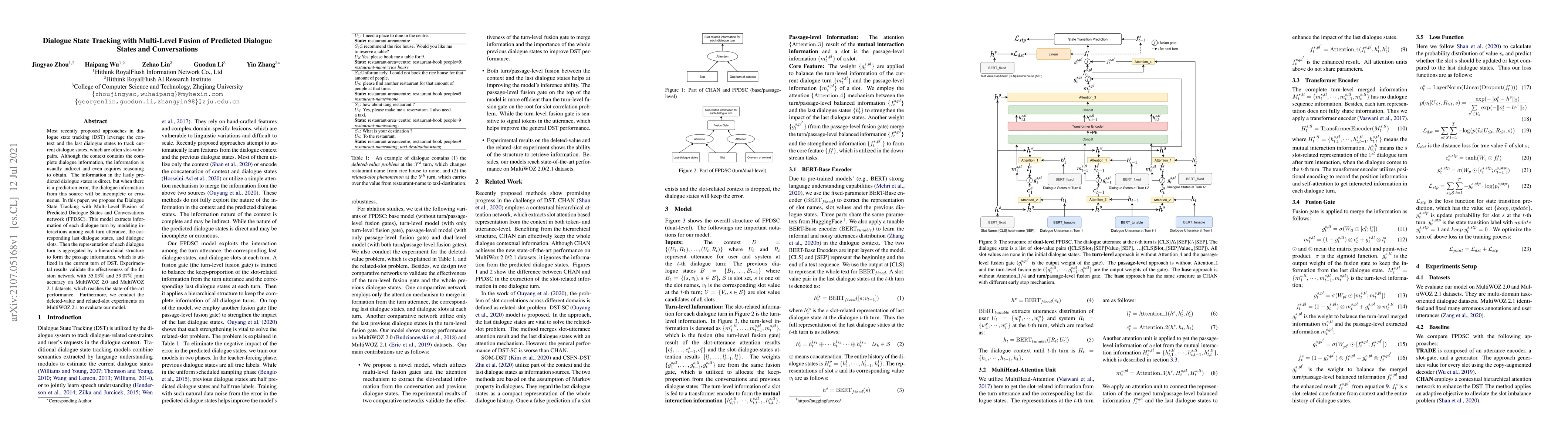 This paper proposes a Dialogue State Tracking model using Multi-Level Fusion of Predicted Dialogue States and Conversations (FPDSC) that combines context and last dialogue states to improve accuracy. The model achieves state-of-the-art performance with 55.03% and 59.07% joint accuracy on MultiWOZ datasets.