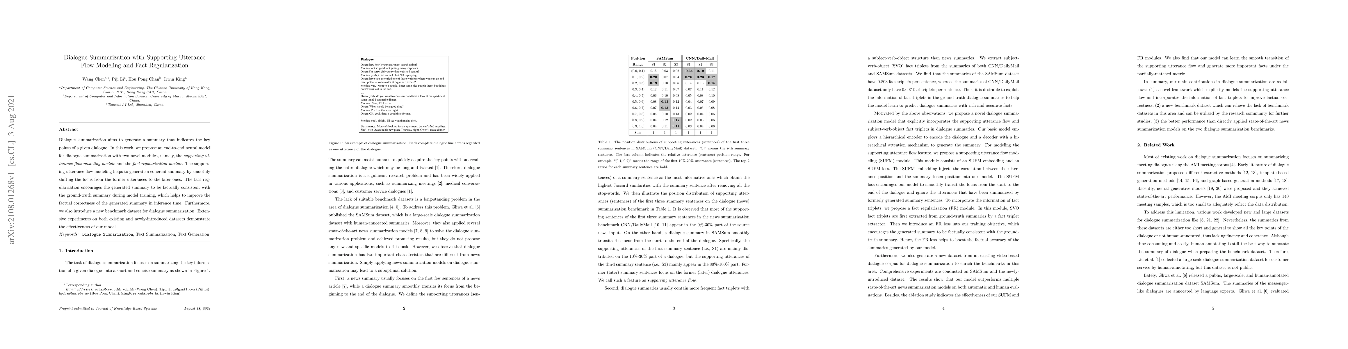 Dialogue summarization aims to generate a summary that indicates the key points of a given dialogue. In this work, we propose an end-to-end neural model for dialogue summarization with two novel modules, namely, the \emph{supporting utterance flow modeling module} and the \emph{fact regularization module}. The supporting utterance flow modeling helps to generate a coherent summary by smoothly shifting the focus from the former utterances to the later ones. The fact regularization encourages the generated summary to be factually consistent with the ground-truth summary during model training, which helps to improve the factual correctness of the generated summary in inference time. Furthermore, we also introduce a new benchmark dataset for dialogue summarization. Extensive experiments on both existing and newly-introduced datasets demonstrate the effectiveness of our model.