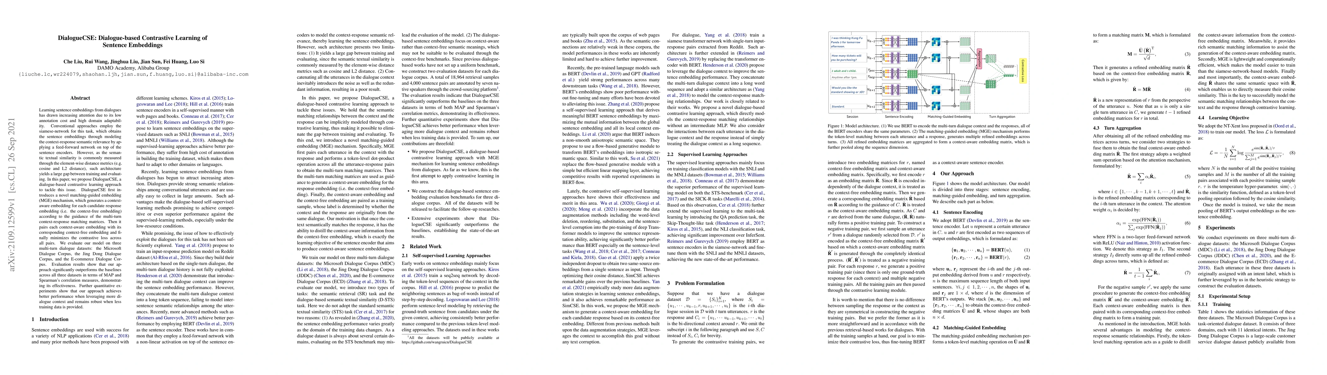 Learning sentence embeddings from dialogues has drawn increasing attention due to its low annotation cost and high domain adaptability. Conventional approaches employ the siamese-network for this task, which obtains the sentence embeddings through modeling the context-response semantic relevance by applying a feed-forward network on top of the sentence encoders. However, as the semantic textual similarity is commonly measured through the element-wise distance metrics (e.g. cosine and L2 distance), such architecture yields a large gap between training and evaluating. In this paper, we propose DialogueCSE, a dialogue-based contrastive learning approach to tackle this issue. DialogueCSE first introduces a novel matching-guided embedding (MGE) mechanism, which generates a context-aware embedding for each candidate response embedding (i.e. the context-free embedding) according to the guidance of the multi-turn context-response matching matrices. Then it pairs each context-aware embedding with its corresponding context-free embedding and finally minimizes the contrastive loss across all pairs. We evaluate our model on three multi-turn dialogue datasets: the Microsoft Dialogue Corpus, the Jing Dong Dialogue Corpus, and the E-commerce Dialogue Corpus. Evaluation results show that our approach significantly outperforms the baselines across all three datasets in terms of MAP and Spearman's correlation measures, demonstrating its effectiveness. Further quantitative experiments show that our approach achieves better performance when leveraging more dialogue context and remains robust when less training data is provided.