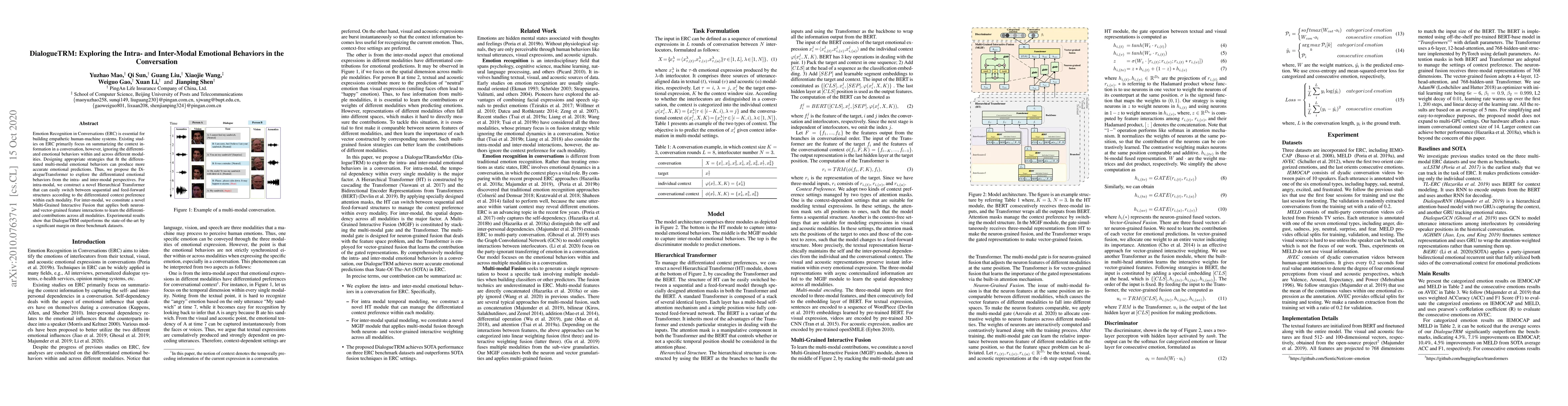 The paper proposes DialogueTRM to enhance Emotion Recognition in Conversations (ERC) by exploring intra- and inter-modal emotional behaviors. It introduces a Hierarchical Transformer for intra-modal analysis and a Multi-Grained Interactive Fusion for inter-modal analysis, achieving superior performance on benchmark datasets.