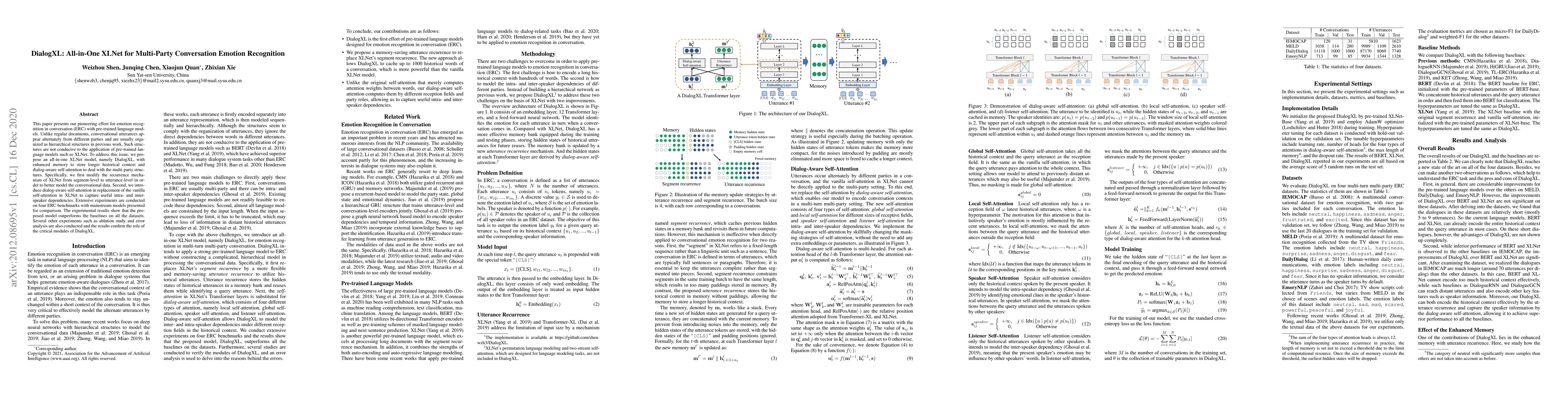 This paper introduces DialogXL, an all-in-one XLNet model for multi-party conversation emotion recognition, featuring enhanced memory and dialog-aware self-attention to better handle hierarchical structures. Experimental results show DialogXL outperforms baselines on four ERC benchmarks, confirming the effectiveness of its key components.