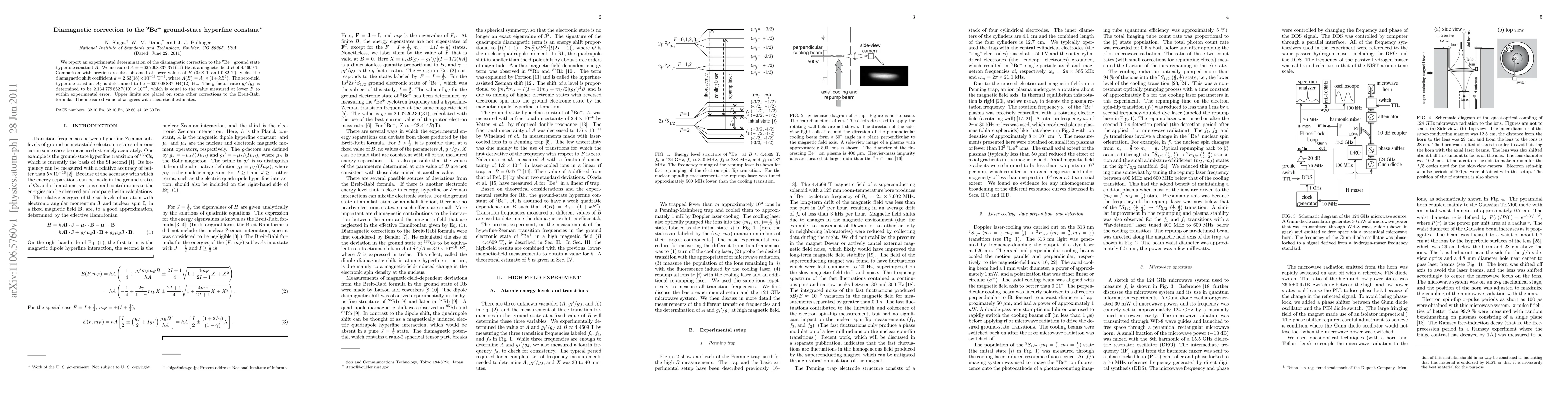 We report an experimental determination of the diamagnetic correction to the $^9$Be$^+$ ground state hyperfine constant $A$. We measured $A$ = $-625\,008\,837.371(11)$ Hz at a magnetic field $B$ of 4.4609 T. Comparison with previous results, obtained at lower values of $B$ (0.68 T and 0.82 T), yields the diamagnetic shift coefficient $k$ = $2.63(18) \times 10^{-11}$ T$^{-2}$, where $A(B)=A_0\times (1+k B^2)$. The zero-field hyperfine constant $A_0$ is determined to be $-625\,008\,837.044(12)$ Hz. The $g$-factor ratio ${g_I}^\prime/g_J$ is determined to be $2.134\,779\,852\,7(10) \times 10^{-4}$, which is equal to the value measured at lower $B$ to within experimental error. Upper limits are placed on some other corrections to the Breit-Rabi formula. The measured value of $k$ agrees with theoretical estimates.