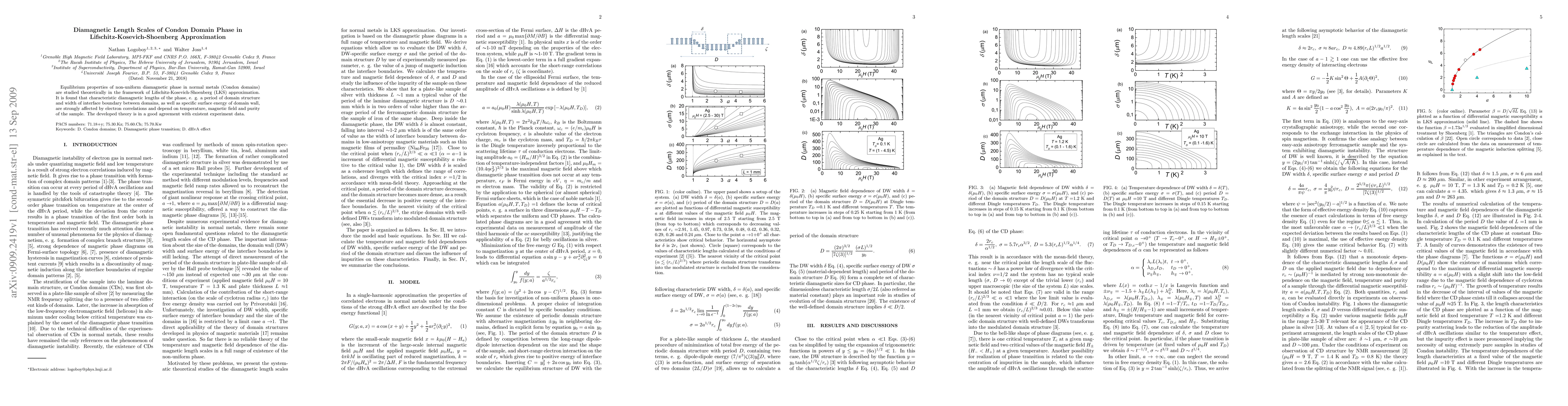 Equilibrium properties of non-uniform diamagnetic phase in normal metals (Condon domains) are studied theoretically in the framework of Lifschitz-Kosevich-Shoenberg (LKS) approximation. It is found that characteristic diamagnetic lengths of the phase, e. g. a period of domain structure and width of interface boundary between domains, as well as specific surface energy of domain wall, are strongly affected by electron correlations and depend on temperature, magnetic field and purity of the sample. The developed theory is in a good agreement with existent experiment data.