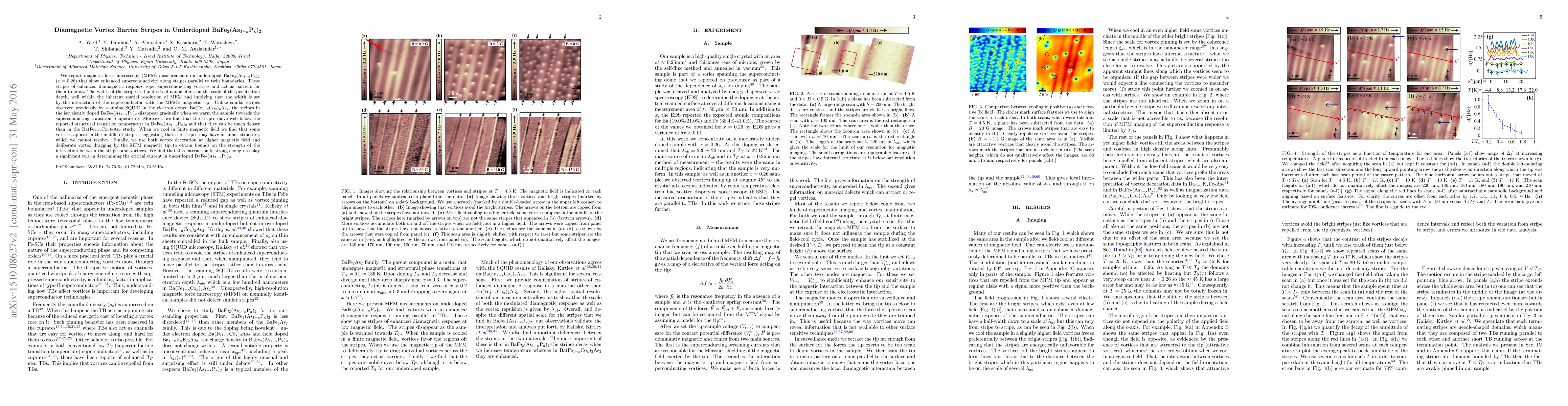 This study used magnetic force microscopy to observe that in underdoped BaFe₂(As₁₋ₓPₓ)₂, certain stripe-like regions enhance superconductivity and repel magnetic vortices, acting as barriers. These stripes, linked to twin boundaries, disappear near the superconducting transition, providing insight into vortex behavior and stripe dynamics in iron-based superconductors.