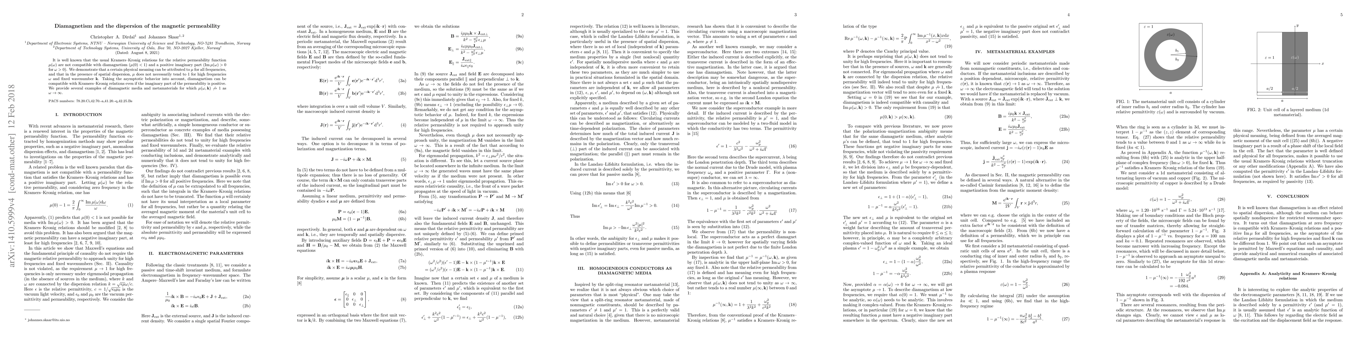 It is well known that the usual Kramers--Kronig relations for the relative permeability function $\mu(\omega)$ are not compatible with diamagnetism ($\mu(0)<1$) and a positive imaginary part ($\text{Im}\,\mu(\omega)>0$ for $\omega>0$). We demonstrate that a certain physical meaning can be attributed to $\mu$ for all frequencies, and that in the presence of spatial dispersion, $\mu$ does not necessarily tend to 1 for high frequencies $\omega$ and fixed wavenumber $\mathbf k$. Taking the asymptotic behavior into account, diamagnetism can be compatible with Kramers--Kronig relations even if the imaginary part of the permeability is positive. We provide several examples of diamagnetic media and metamaterials for which $\mu(\omega,\mathbf k)\not\to 1$ as $\omega\to\infty$.