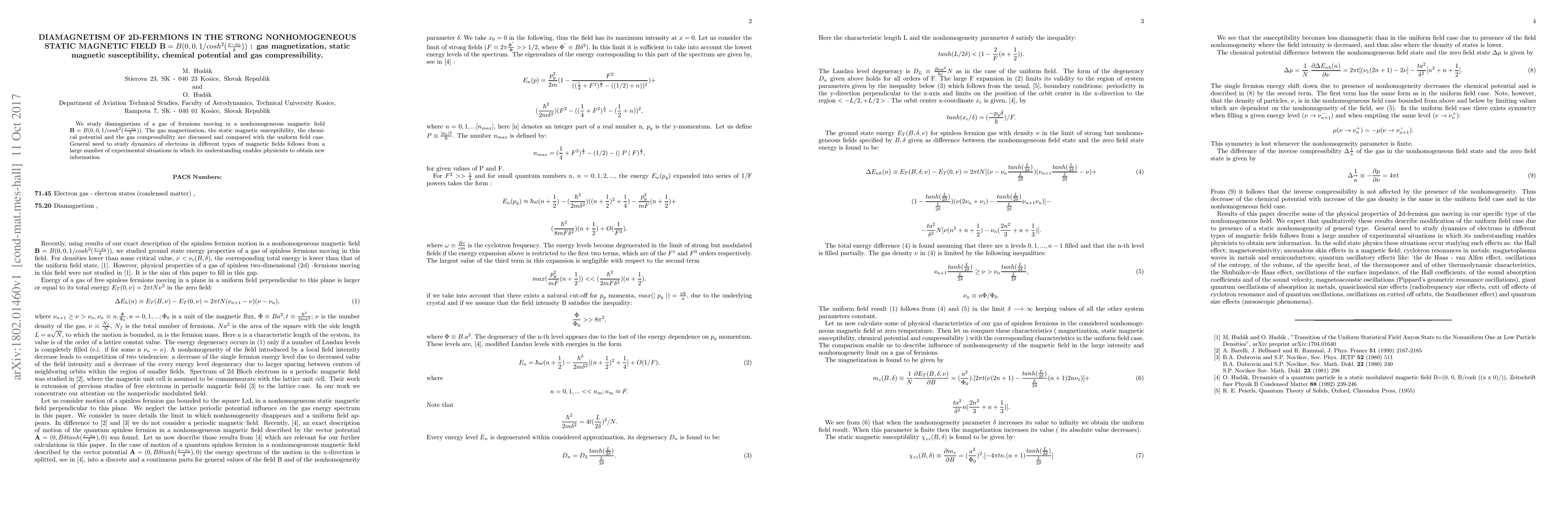 We study diamagnetism of a gas of fermions moving in a nonhomogeneous magnetic field $( {\bf B} =B( 0, 0, 1/cosh^{2}( \frac{x-x_{0} }{ \delta })))$ The gas magnetization, the static magnetic susceptibility, the chemical potential and the gas compressibility are discussed and compared with the uniform field case. General need to study dynamics of electrons in different types of magnetic fields follows from a large number of experimental situations in which its understanding enables physicists to obtain new information.