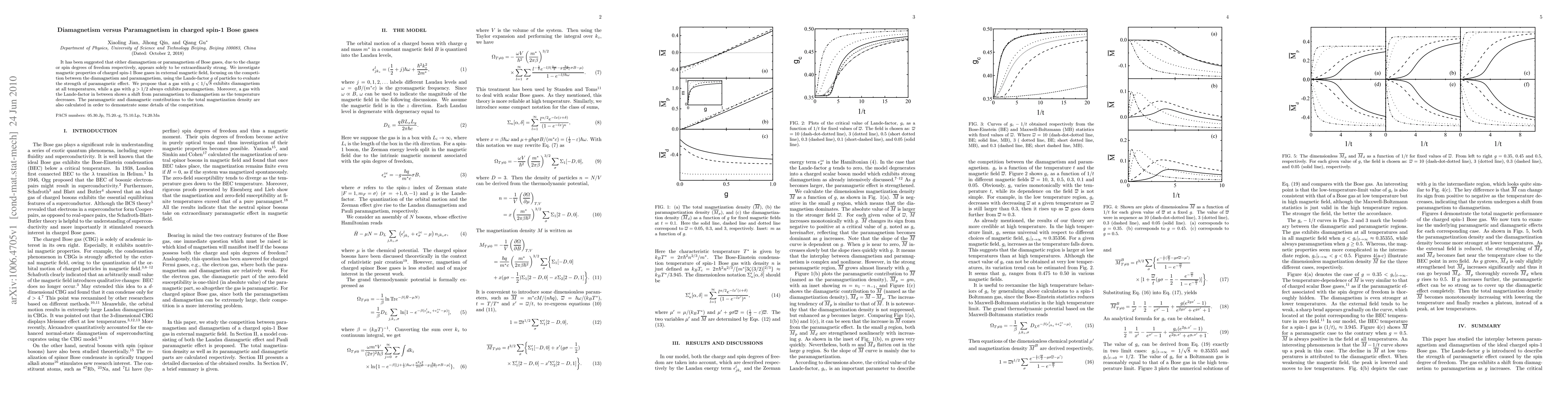 This research explores the magnetic properties of charged spin-1 Bose gases in magnetic fields, revealing that a gas with Lande-factor g < 1/√8 exhibits diamagnetism at all temperatures, while g > 1/2 always shows paramagnetism. A gas with g between these values shifts from paramagnetism to diamagnetism as temperature decreases, with calculations of paramagnetic and diamagnetic contributions to magnetization density.