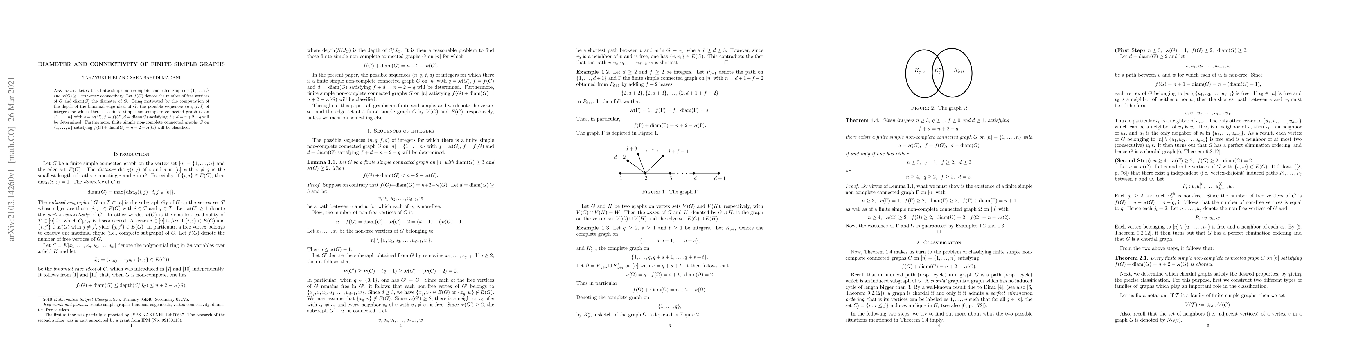 Let $G$ be a finite simple non-complete connected graph on $\{1, \ldots, n\}$ and $\kappa(G) \geq 1$ its vertex connectivity. Let $f(G)$ denote the number of free vertices of $G$ and $\mathrm{diam}(G)$ the diameter of $G$. Being motivated by the computation of the depth of the binomial edge ideal of $G$, the possible sequences $(n, q, f, d)$ of integers for which there is a finite simple non-complete connected graph $G$ on $\{1, \ldots, n\}$ with $q = \kappa(G), f = f(G), d = \mathrm{diam}(G)$ satisfying $f + d = n + 2 - q$ will be determined. Furthermore, finite simple non-complete connected graphs $G$ on $\{1, \ldots, n\}$ satisfying $f(G) + \mathrm{diam}(G) = n + 2 - \kappa(G)$ will be classified.