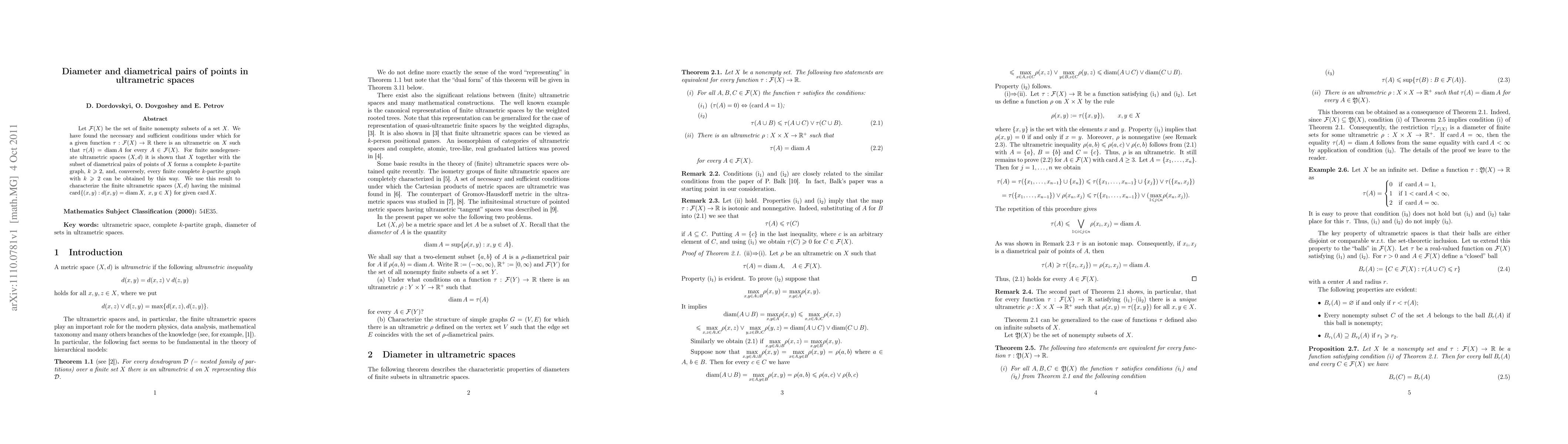 Let F(X) be the set of finite nonempty subsets of a set X. We have found the necessary and sufficient conditions under which for a given function f:F(X)-->R there is an ultrametric on X such that f(A)=diam A for every A\in F(X). For finite nondegenerate ultrametric spaces (X,d) it is shown that X together with the subset of diametrical pairs of points of X forms a complete k-partite graph, k>= 2, and, conversely, every finite complete k-partite graph with k>=2 can be obtained by this way. We use this result to characterize the finite ultrametric spaces (X,d) having the minimal card{(x,y):d(x,y)=diam X, x,y \in X} for given card X.