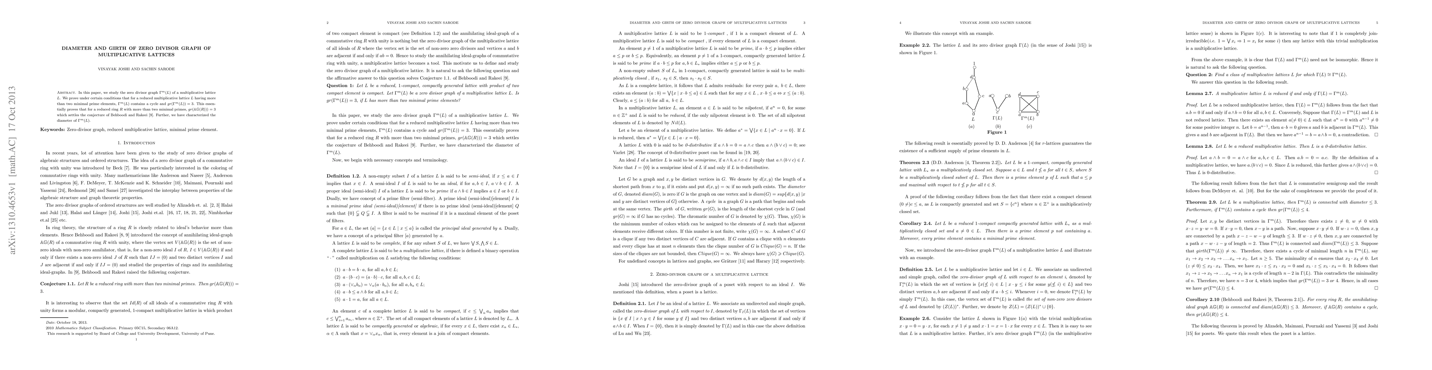 In this paper, we study the zero divisor graph $\Gamma^m(L)$ of a multiplicative lattice L. We prove under certain conditions that for a reduced multiplicative lattice L having more than two minimal prime elements, $\Gamma^m(L)$ contains a cycle and $gr(\Gamma^m(L)) = 3$. This essentially proves that for a reduced ring R with more than two minimal primes, $gr(\mathbb{AG}(R))) = 3$ which settles the conjecture of Behboodi and Rakeei [9]. Further, we have characterized the diameter of $\Gamma^m(L)$.