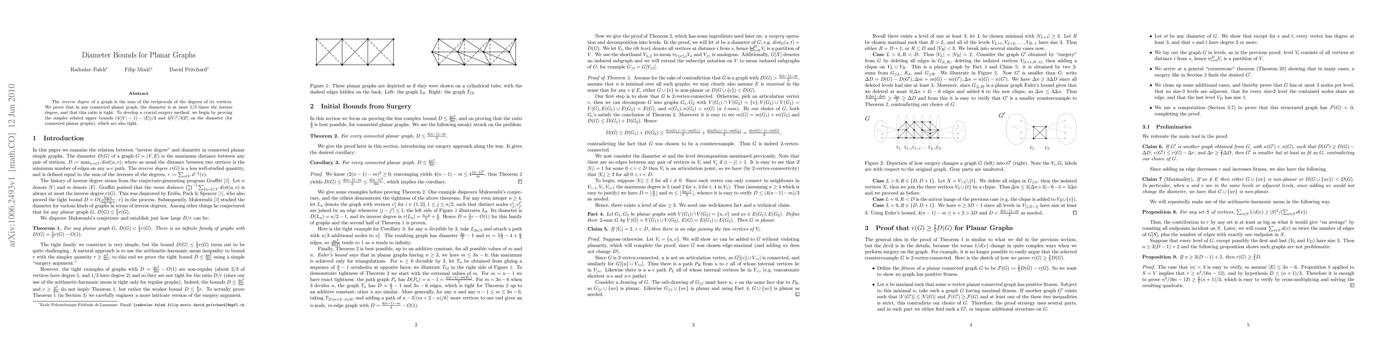 The paper establishes upper bounds on the diameter of connected planar graphs, proving that the diameter is at most 5/2 times the inverse degree, and demonstrates this ratio is optimal. The study also presents two tight bounds: (4(V-1)-E)/3 and 4V^2/3E for the diameter.