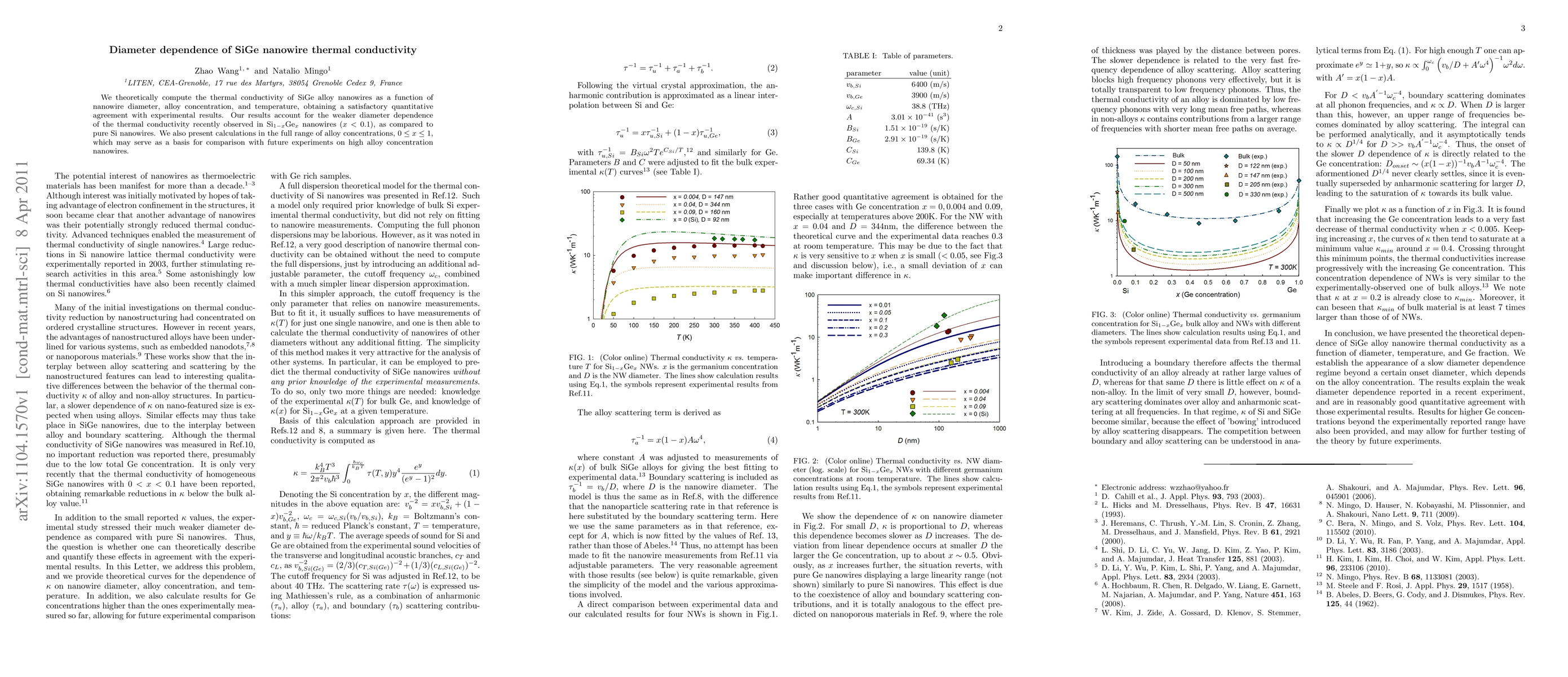 This paper theoretically investigates the thermal conductivity of SiGe alloy nanowires, showing a weaker diameter dependence than in pure Si nanowires, and provides quantitative agreement with experimental data. It also covers a broad range of alloy concentrations for future experimental validation.