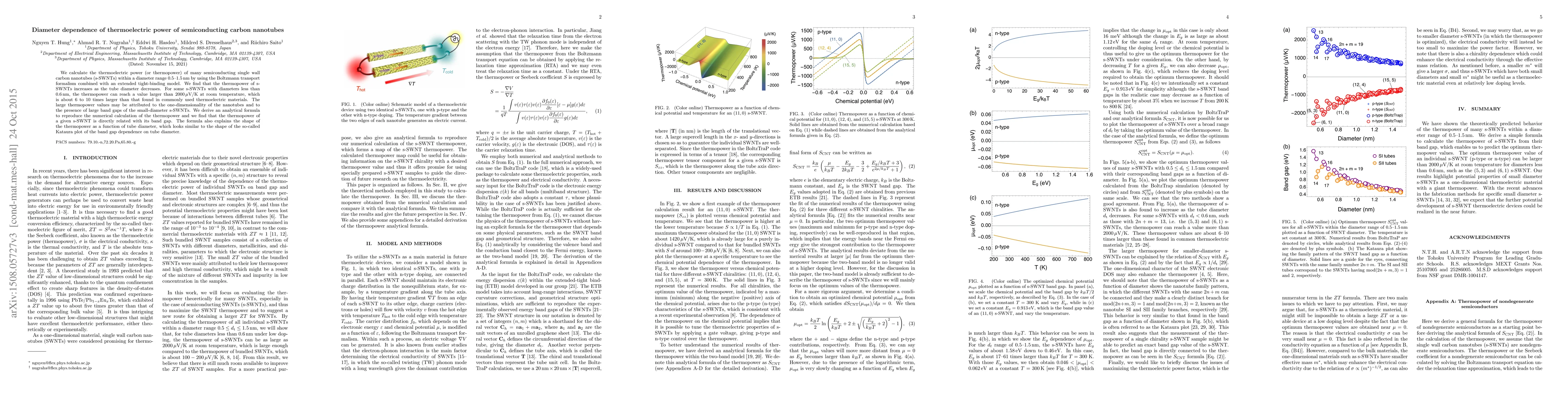 This study investigates the thermoelectric power of semiconducting single-wall carbon nanotubes (s-SWNTs) using the Boltzmann transport formalism and tight-binding model, finding that thermopower increases with decreasing tube diameter. The thermopower can exceed 2000 μV/K for diameters below 0.6 nm, significantly higher than typical thermoelectric materials, due to the nanotubes' one-dimensionality and large band gaps.