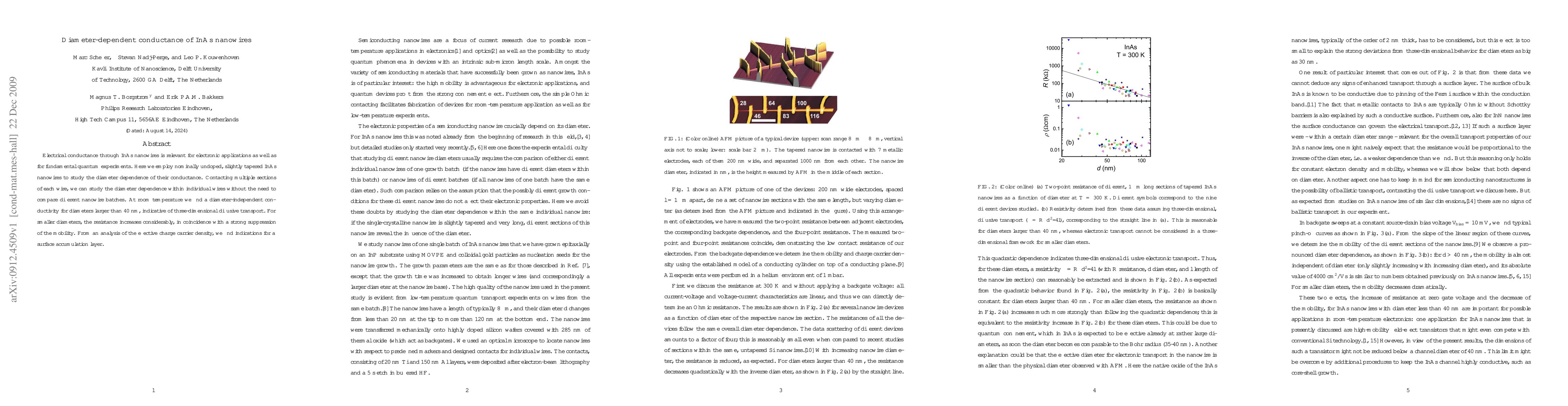 This study investigates the diameter-dependent conductance of InAs nanowires, finding that larger diameters (over 40 nm) exhibit diameter-independent conductivity due to three-dimensional transport. For smaller diameters, resistance increases significantly, accompanied by reduced mobility and evidence of a surface accumulation layer.