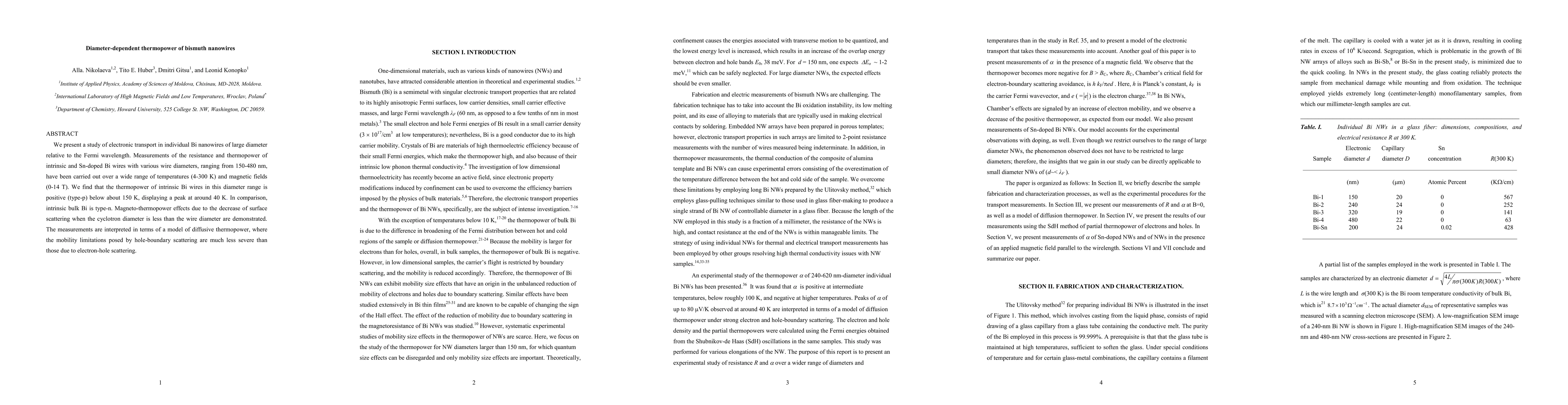 We present a study of electronic transport in individual Bi nanowires of large diameter relative to the Fermi wavelength. Measurements of the resistance and thermopower of intrinsic and Sn-doped Bi wires with various wire diameters, ranging from 150-480 nm, have been carried out over a wide range of temperatures (4-300 K) and magnetic fields (0-14 T). We find that the thermopower of intrinsic Bi wires in this diameter range is positive (type-p) below about 150 K, displaying a peak at around 40 K. In comparison, intrinsic bulk Bi is type-n. Magneto-thermopower effects due to the decrease of surface scattering when the cyclotron diameter is less than the wire diameter are demonstrated. The measurements are interpreted in terms of a model of diffusive thermopower, where the mobility limitations posed by hole-boundary scattering are much less severe than those due to electron-hole scattering.