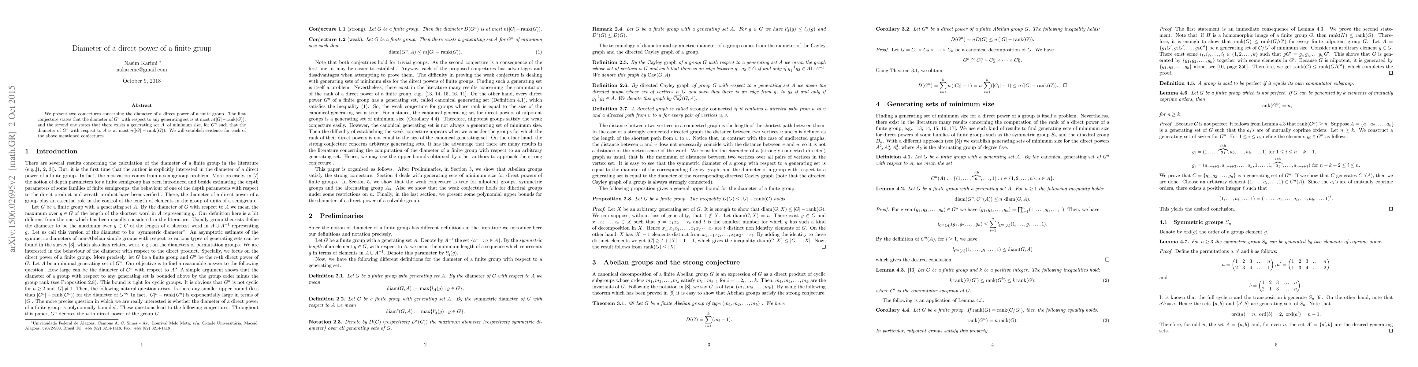 We present two conjectures concerning the diameter of a direct power of a finite group. The first conjecture states that the diameter of G^n with respect to any generating set is at most n(|G|-rank(G)); and the second one states that there exists a generating set A, of minimum size, for G^n such that the diameter of G^n with respect to A is at most n(|G|-rank(G)). We will establish evidence for each of the above mentioned conjectures.