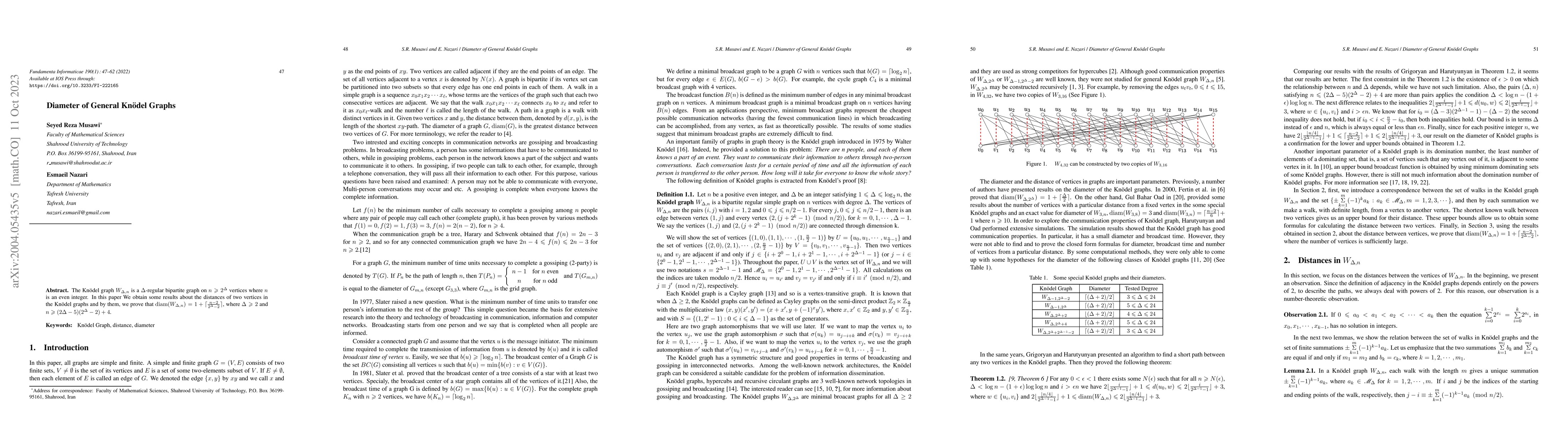 The Kn\"odel graph $W_{\Delta,n}$ is a $\Delta$-regular bipartition graph on $n\ge 2^{\Delta}$ vertices and $n$ is an even integer. The vertices of $W_{\Delta,n}$ are the pairs $(i,j)$ with $i=1,2$ and $0\le j\le n/2-1$. For every $j$, $0\le j\le n/2-1$, there is an edge between vertex $(1, j)$ and every vertex $(2,(j+2^k-1) \mod (n/2))$, for $k=0,1,\cdots,\Delta-1$. In this paper we obtain some formulas for evaluating the distance of vertices of the Kn\"odel graph and by them, we provide the formula $diam(W_{\Delta,n})=1+\lceil\frac{n-2}{2^{\Delta}-2}\rceil$ for the diameter of $W_{\Delta,n}$, where $n\ge (2\Delta-5)(2^{\Delta}-2)+4$.