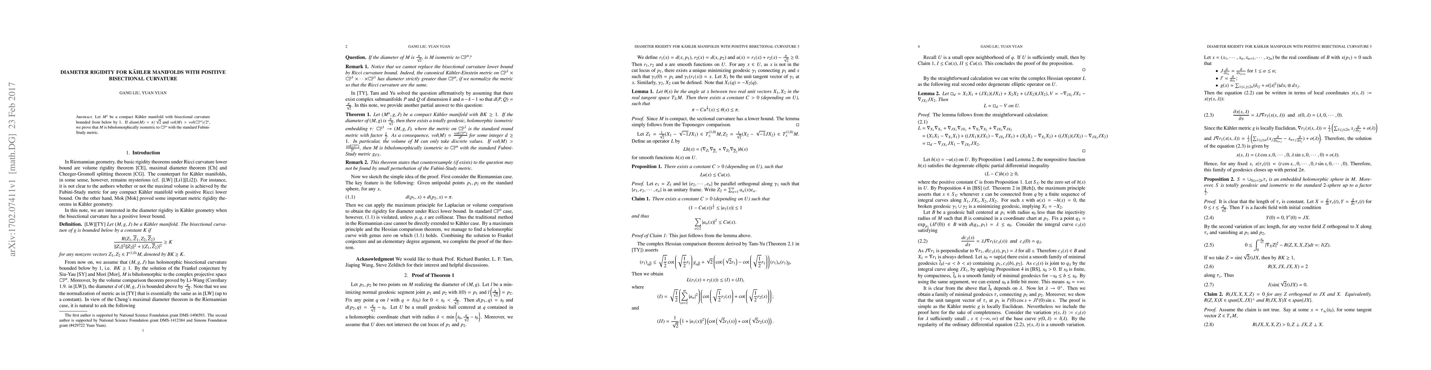 Let $M^n$ be a compact K\"ahler manifold with bisectional curvature bounded from below by $1$. If $diam(M) = \pi / \sqrt{2}$ and $vol(M)> vol(\mathbb{C}\mathbb{P}^n)/ 2^n$, we prove that $M$ is biholomorphically isometric to $\mathbb{C}\mathbb{P}^n$ with the standard Fubini-Study metric.