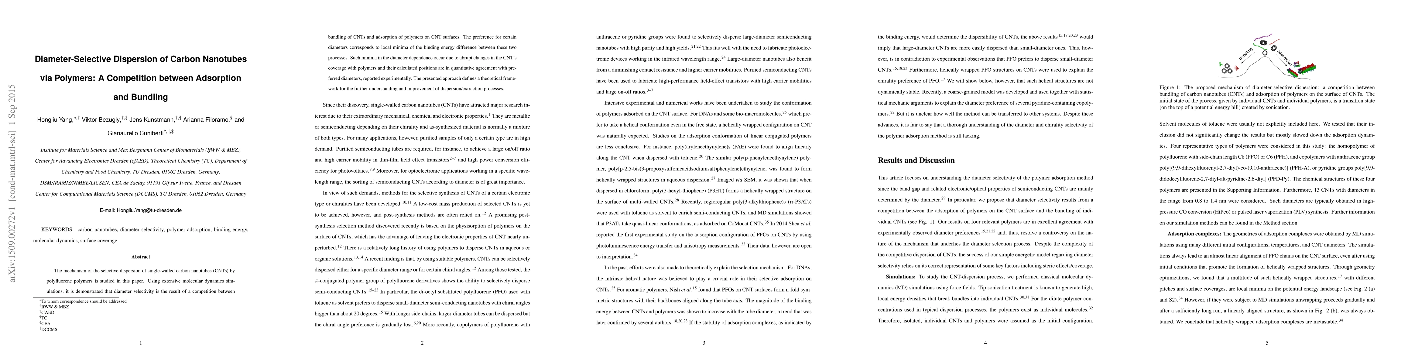 This study uses molecular dynamics simulations to show that the selective dispersion of carbon nanotubes by polyfluorene polymers is due to a balance between CNT bundling and polymer adsorption. The preference for specific nanotube diameters results from local minima in binding energy differences, aligning with experimental findings. This research provides a theoretical foundation for enhancing dispersion and extraction processes.