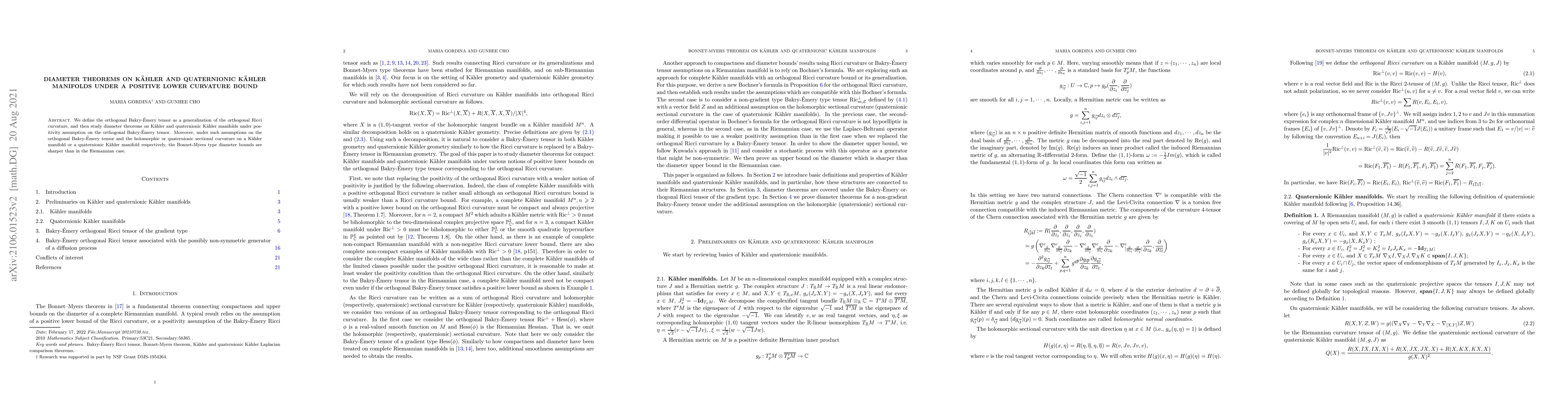 The paper defines the orthogonal Bakry-Émery tensor to generalize the orthogonal Ricci curvature and explores diameter theorems on Kähler and quaternionic Kähler manifolds with positive lower bounds on this tensor. It shows that under these conditions, the diameter bounds are more precise than in the standard Riemannian case.