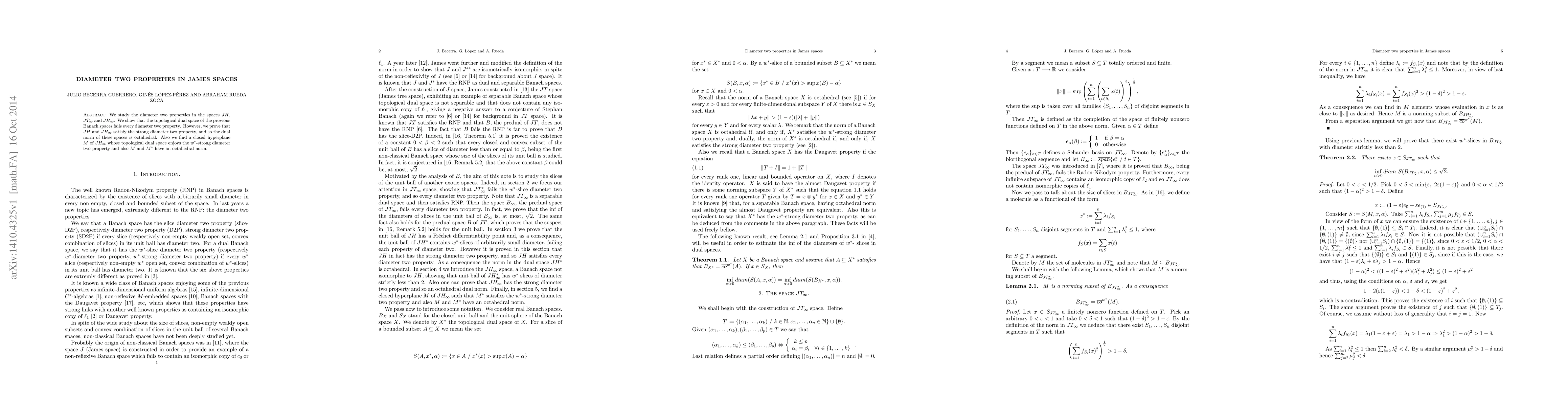 This paper investigates diameter two properties in James spaces $JH$, $JT_\infty$, and $JH_\infty$, proving that their dual spaces lack such properties. However, it shows that $JH$ and $JH_\infty$ satisfy the strong diameter two property, leading to an octahedral dual norm, and identifies a closed hyperplane in $JH_\infty$ with a $w^*$-strong diameter two property and octahedral norm.