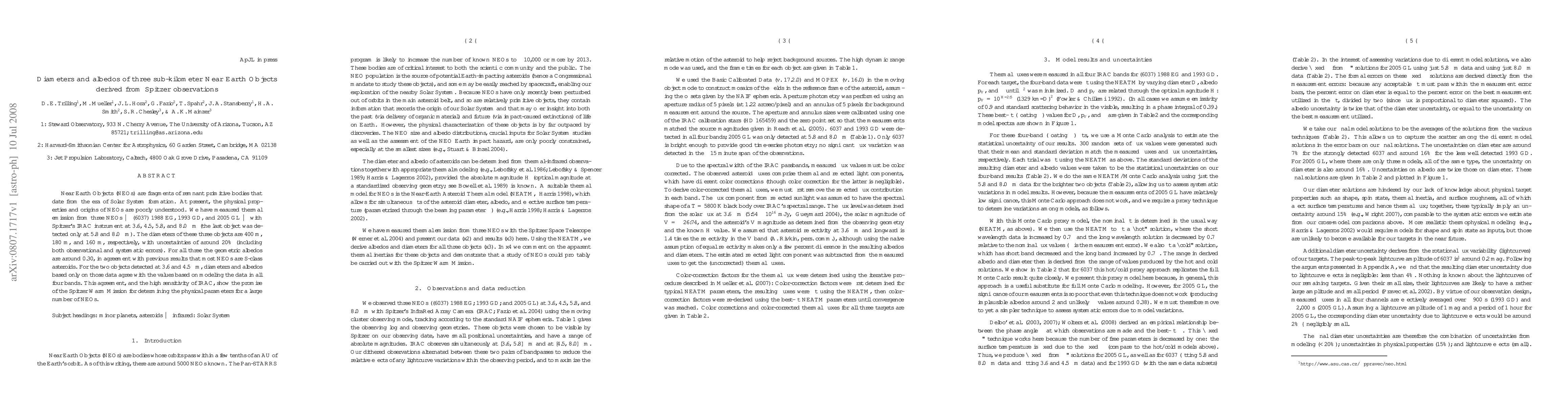 Near Earth Objects (NEOs) are fragments of remnant primitive bodies that date from the era of Solar System formation. At present, the physical properties and origins of NEOs are poorly understood. We have measured thermal emission from three NEOs -- (6037) 1988 EG, 1993 GD, and 2005 GL -- with Spitzer's IRAC instrument at 3.6, 4.5, 5.8, and 8.0 microns (the last object was detected only at 5.8 and 8.0 microns). The diameters of these three objects are 400 m, 180 m, and 160 m, respectively, with uncertainties of around 20% (including both observational and systematic errors). For all three the geometric albedos are around 0.30, in agreement with previous results that most NEOs are S-class asteroids. For the two objects detected at 3.6 and 4.5 microns, diameters and albedos based only on those data agree with the values based on modeling the data in all four bands. This agreement, and the high sensitivity of IRAC, show the promise of the Spitzer Warm Mission for determining the physical parameters for a large number of NEOs.