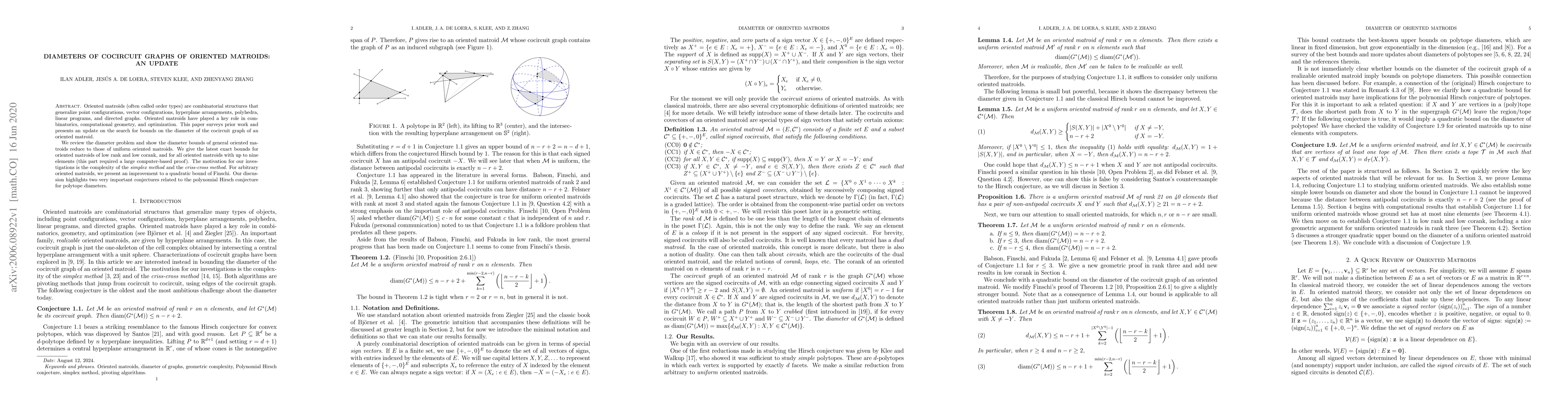 Oriented matroids (often called order types) are combinatorial structures that generalize point configurations, vector configurations, hyperplane arrangements, polyhedra, linear programs, and directed graphs. Oriented matroids have played a key role in combinatorics, computational geometry, and optimization. This paper surveys prior work and presents an update on the search for bounds on the diameter of the cocircuit graph of an oriented matroid. We review the diameter problem and show the diameter bounds of general oriented matroids reduce to those of uniform oriented matroids. We give the latest exact bounds for oriented matroids of low rank and low corank, and for all oriented matroids with up to nine elements (this part required a large computer-based proof). The motivation for our investigations is the complexity of the simplex method and the criss-cross method. For arbitrary oriented matroids, we present an improvement to a quadratic bound of Finschi. Our discussion highlights two very important conjectures related to the polynomial Hirsch conjecture for polytope diameters.