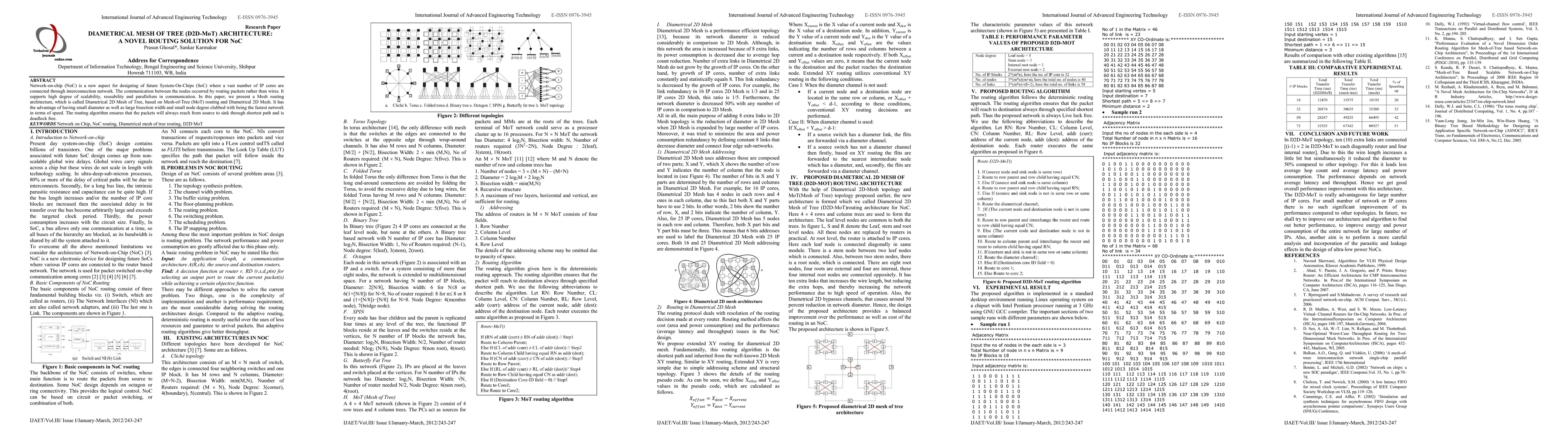 Network-on-chip (NoC) is a new aspect for designing of future System-On-Chips (SoC) where a vast number of IP cores are connected through interconnection network. The communication between the nodes occurred by routing packets rather than wires. It supports high degree of scalability, reusability and parallelism in communication. In this paper, we present a Mesh routing architecture, which is called Diametrical 2D Mesh of Tree, based on Mesh-of-Tree (MoT) routing and Diametrical 2D Mesh. It has the advantage of having small diameter as well as large bisection width and small node degree clubbed with being the fastest network in terms of speed. The routing algorithm ensures that the packets will always reach from source to sink through shortest path and is deadlock free.