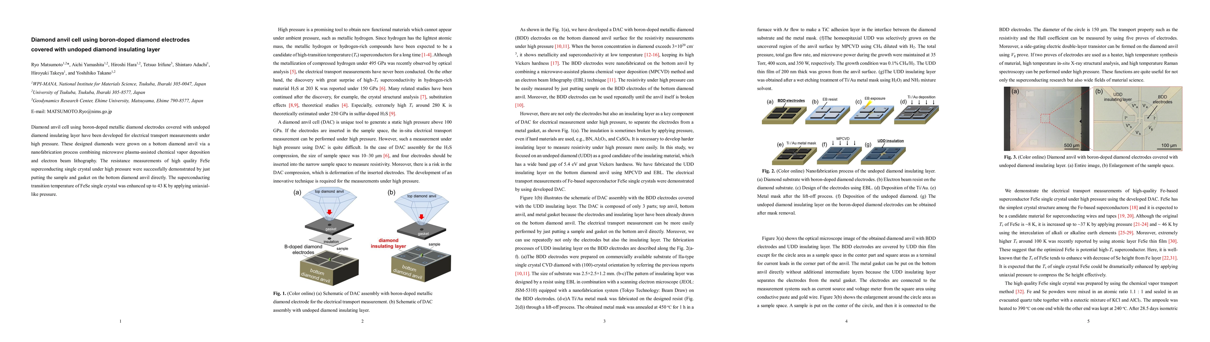 This paper describes the development of a diamond anvil cell with boron-doped diamond electrodes and an undoped diamond insulating layer for high-pressure electrical transport measurements. The cell was successfully used to enhance the superconducting transition temperature of FeSe single crystal to 43 K under applied pressure.