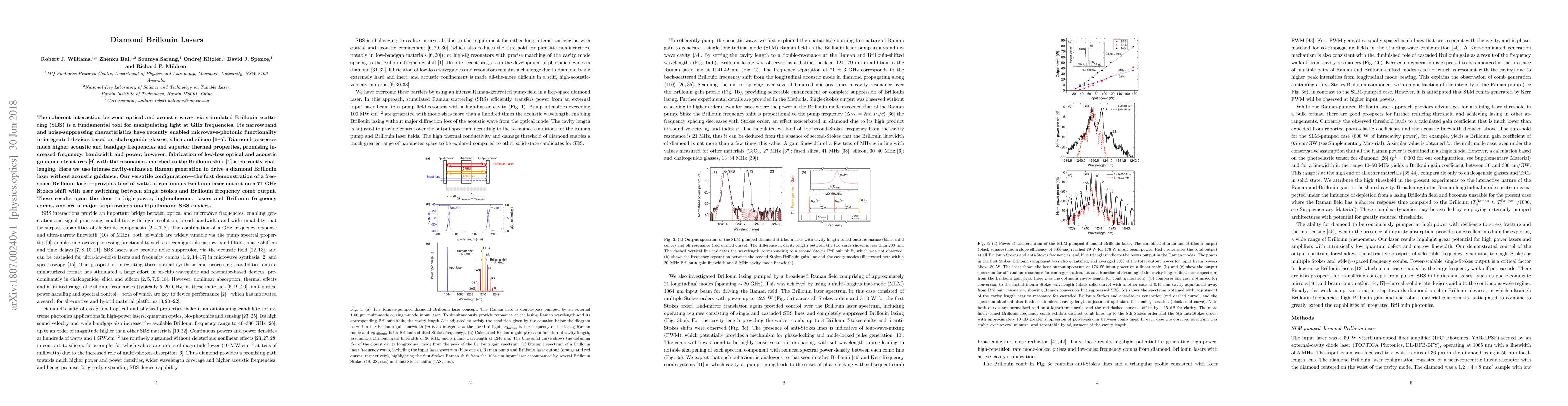 The coherent interaction between optical and acoustic waves via stimulated Brillouin scattering (SBS) is a fundamental tool for manipulating light at GHz frequencies. Its narrowband and noise-suppressing characteristics have recently enabled microwave-photonic functionality in integrated devices based on chalcogenide glasses, silica and silicon. Diamond possesses much higher acoustic and bandgap frequencies and superior thermal properties, promising increased frequency, bandwidth and power; however, fabrication of low-loss optical and acoustic guidance structures with the resonances matched to the Brillouin shift is currently challenging. Here we use intense cavity-enhanced Raman generation to drive a diamond Brillouin laser without acoustic guidance. Our versatile configuration - the first demonstration of a free-space Brillouin laser - provides tens-of-watts of continuous Brillouin laser output on a 71 GHz Stokes shift with user switching between single Stokes and Brillouin frequency comb output. These results open the door to high-power, high-coherence lasers and Brillouin frequency combs, and are a major step towards on-chip diamond SBS devices.