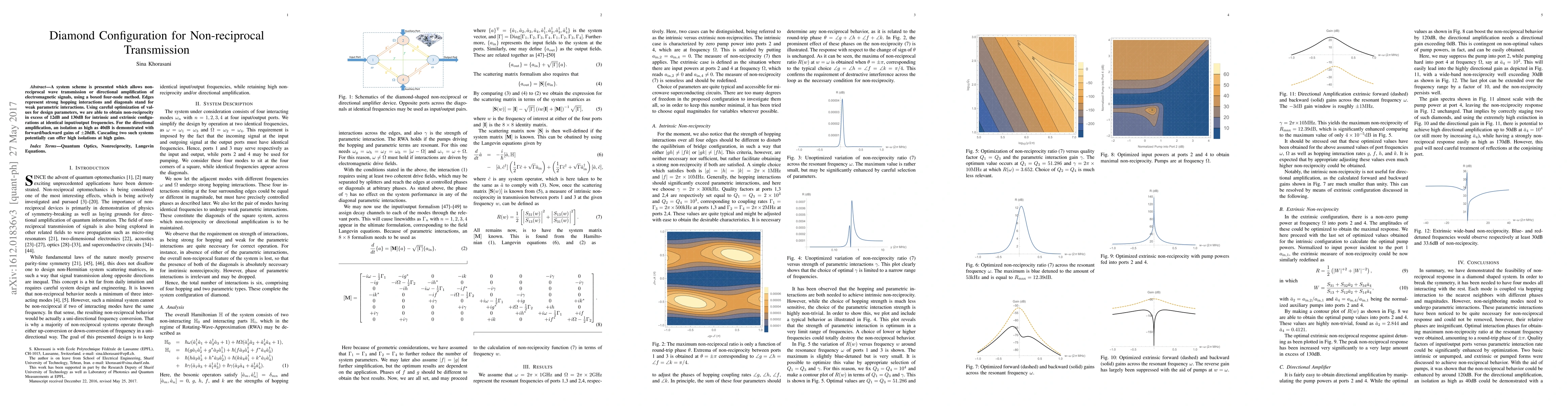 This work demonstrates the feasibility of non-reciprocal response in a diamond-shaped system, which could lead to advancements in microwave and optical technologies, including isolators, circulators, and amplifiers.