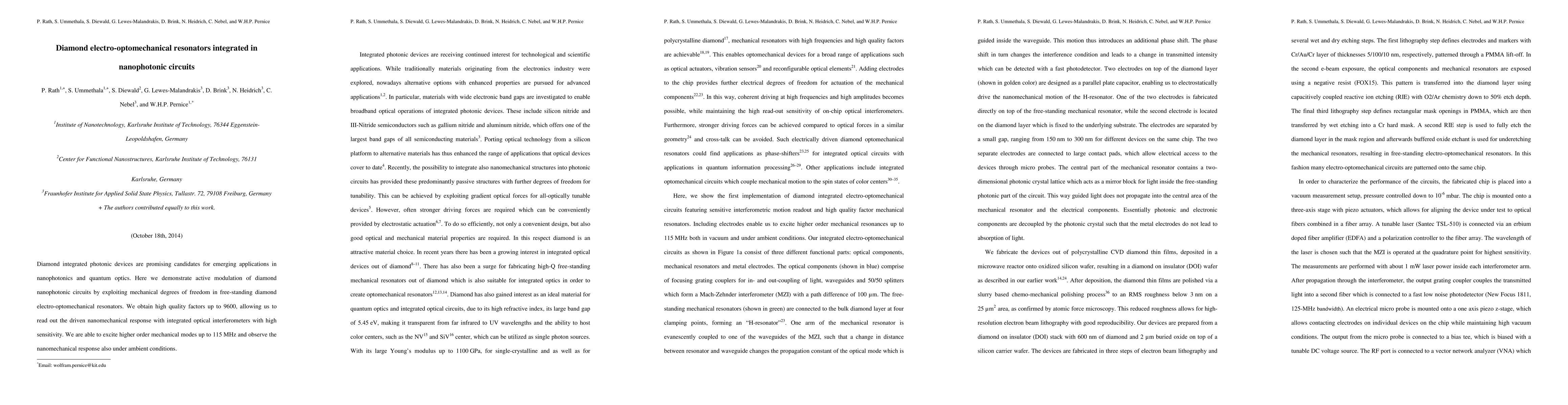 The development of high-quality factor diamond electro-optomechanical resonators integrated in nanophotonic circuits.