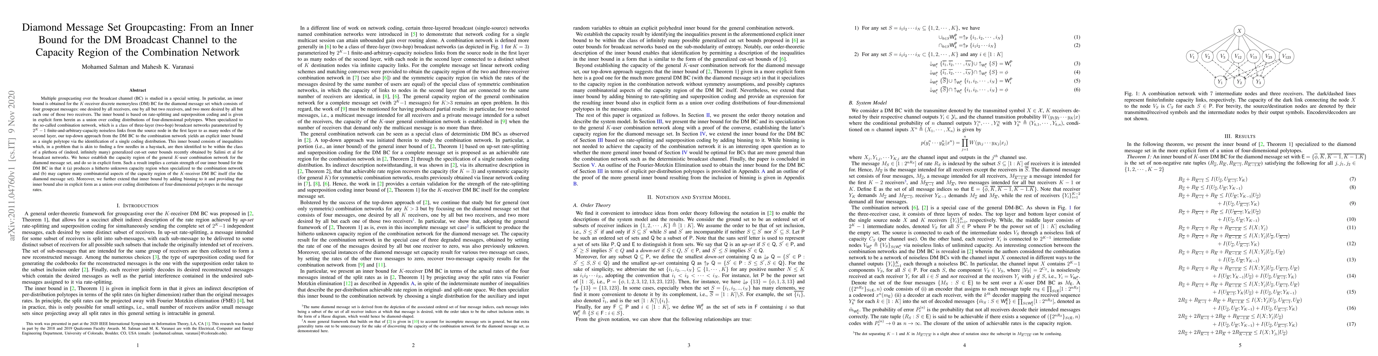 Multiple groupcasting over the broadcast channel (BC) is studied. In particular, an inner bound is obtained for the $K$-receiver discrete memoryless (DM) BC for the diamond message set which consists of four groupcast messages: one desired by all receivers, one by all but two receivers, and two more desired by all but each one of those two receivers. The inner bound is based on rate-splitting and superposition coding and is given in explicit form herein as a union over coding distributions of four-dimensional polytopes. When specialized to the so-called combination network, which is a class of three-layer (two-hop) broadcast networks parameterized by $2^K-1$ finite-and-arbitrary-capacity noiseless links from the source node in the first layer to as many nodes of the second layer, our top-down approach from the DM BC to the combination network yields an explicit inner bound as a single polytope via the identification of a single coding distribution. This inner bound consists of inequalities which are then identified to be within the class of a plethora of (indeed, infinitely many) generalized cut-set outer bounds recently obtained by Salimi et al for broadcast networks. We hence establish the capacity region of the general $K$-user combination network for the diamond message set, and do so in explicit form. Such a result implies a certain strength of our inner bound for the DM BC in that it (a) produces a hitherto unknown capacity region when specialized to the combination network and (b) may capture many combinatorial aspects of the capacity region of the $K$-receiver DM BC itself (for the diamond message set). Moreover, we further extend that inner bound by adding binning to it and providing that inner bound also in explicit form as a union over coding distributions of four-dimensional polytopes in the message rates.