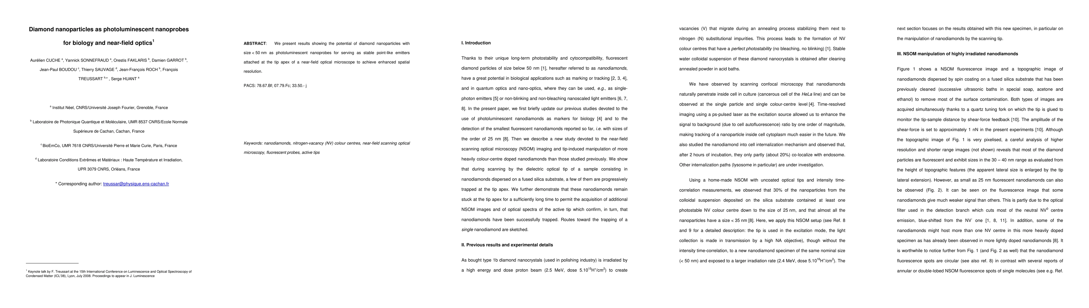 Summary: Diamond nanoparticles under 50 nm in size exhibit photoluminescent properties, making them effective nanoprobes for near-field optical microscopy, enhancing spatial resolution when attached to the tip apex of a microscope.