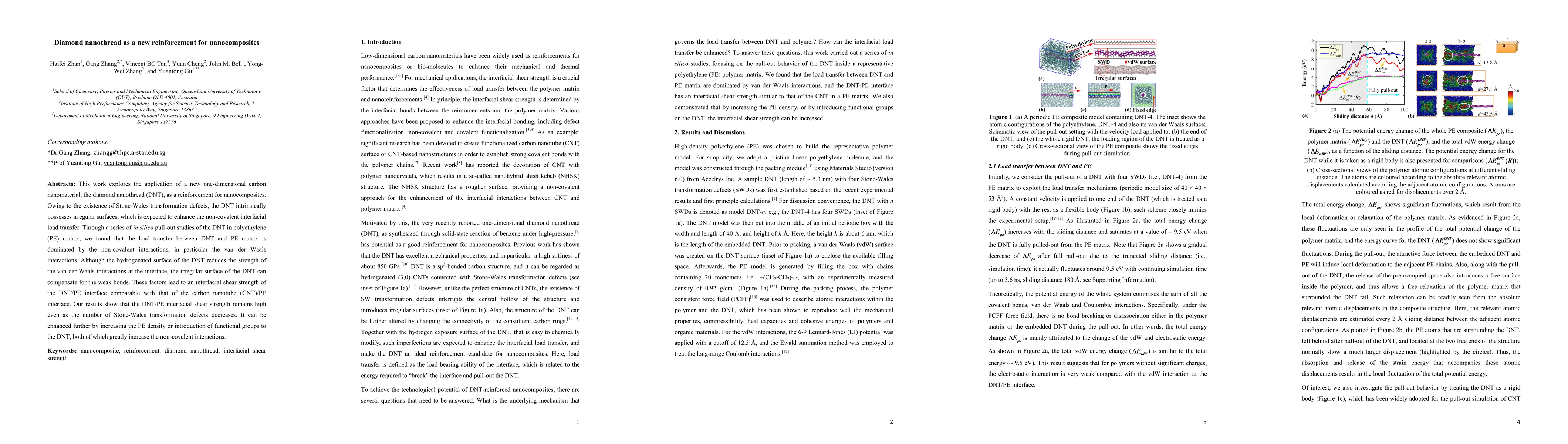 This study investigates diamond nanothread (DNT) as a reinforcement for nanocomposites, finding that its irregular surface enhances non-covalent interfacial load transfer, particularly through van der Waals interactions, leading to high interfacial shear strength comparable to carbon nanotubes. The strength can be further improved by increasing polyethylene density or introducing functional groups to the DNT.