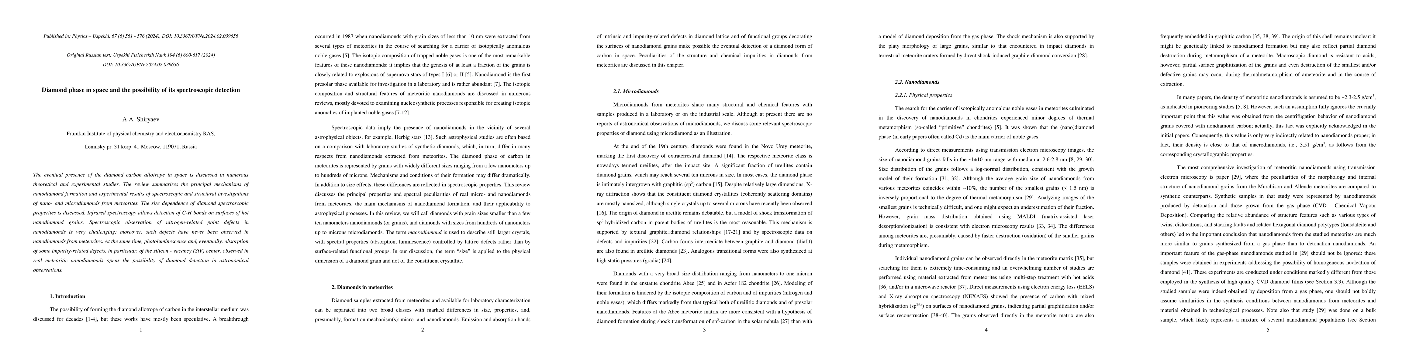 This paper reviews the potential existence of diamond carbon allotropes in space, focusing on nanodiamond formation mechanisms and spectroscopic detection methods. It highlights the challenges in observing nitrogen defects but notes that photoluminescence from silicon-vacancy centers in meteoritic nanodiamonds could enable astronomical detection.