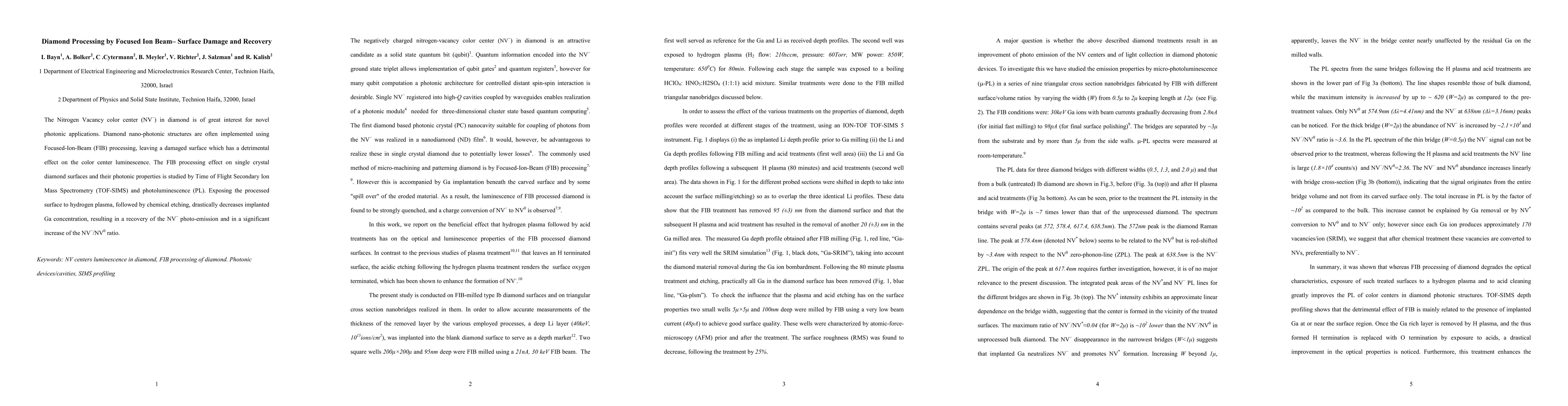 Researchers studied the impact of Focused Ion Beam processing on diamond surfaces, finding that exposing damaged areas to hydrogen plasma and chemical etching can recover the Nitrogen Vacancy color center's luminescence and increase its stability.