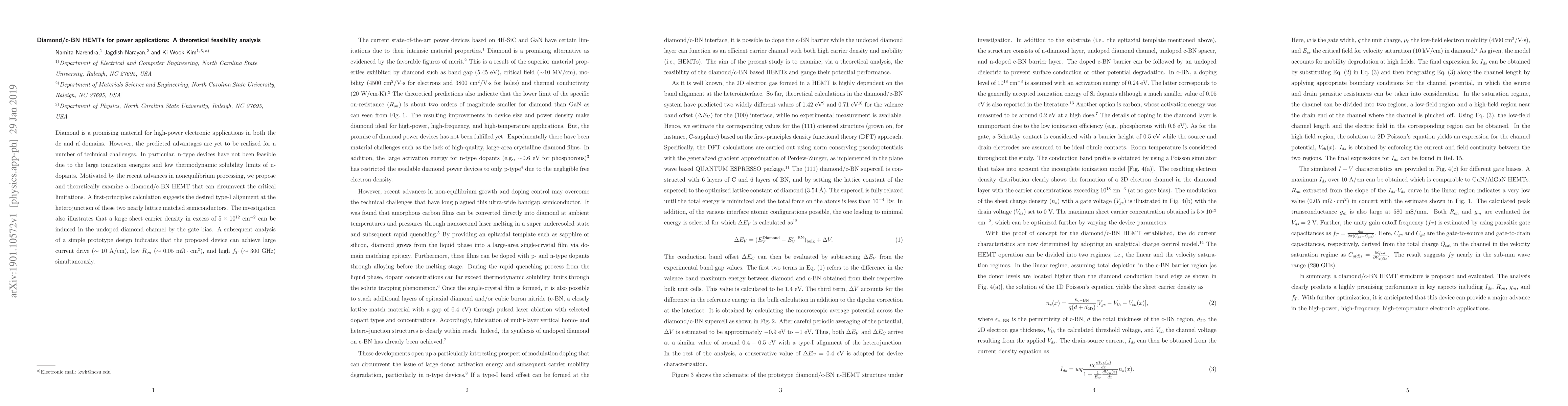 The paper presents a novel diamond/c-BN HEMT structure and its theoretical feasibility analysis, demonstrating promising performance in key aspects such as I_ds, R_on, g_m, and f_T.