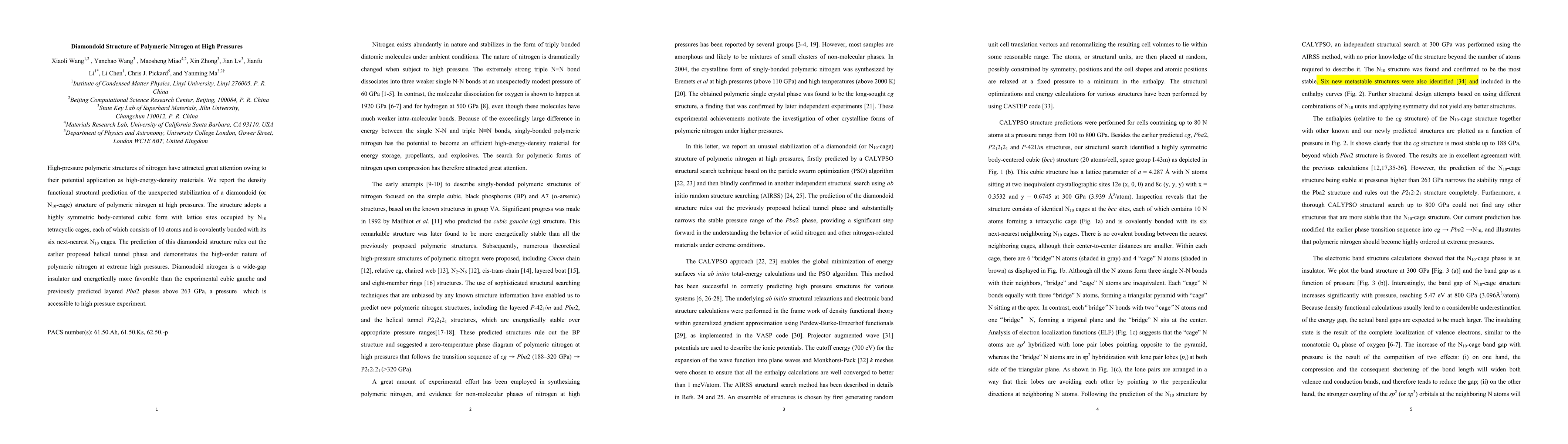 This research predicts the stabilization of a diamondoid structure for polymeric nitrogen at high pressures, showing a body-centered cubic form with N10 tetracyclic cages. This structure is energetically favorable and rules out earlier helical tunnel phase predictions, suggesting a high-order nature for nitrogen under extreme pressure conditions.