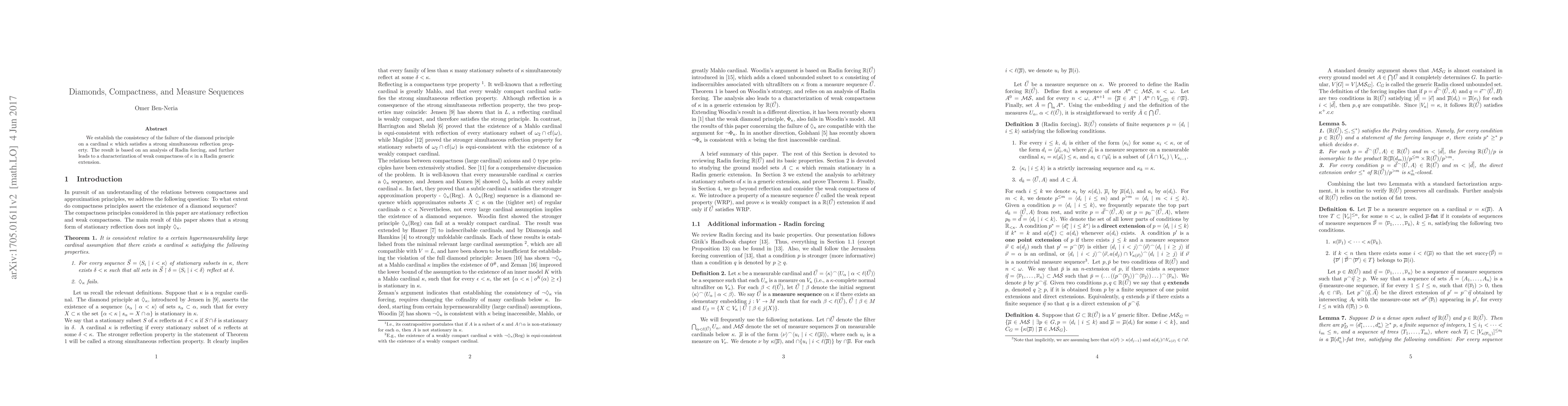 This paper proves the consistency of the failure of the diamond principle on a cardinal $\kappa$ with a strong reflection property, utilizing Radin forcing and characterizing $\kappa$'s weak compactness in a Radin generic extension.