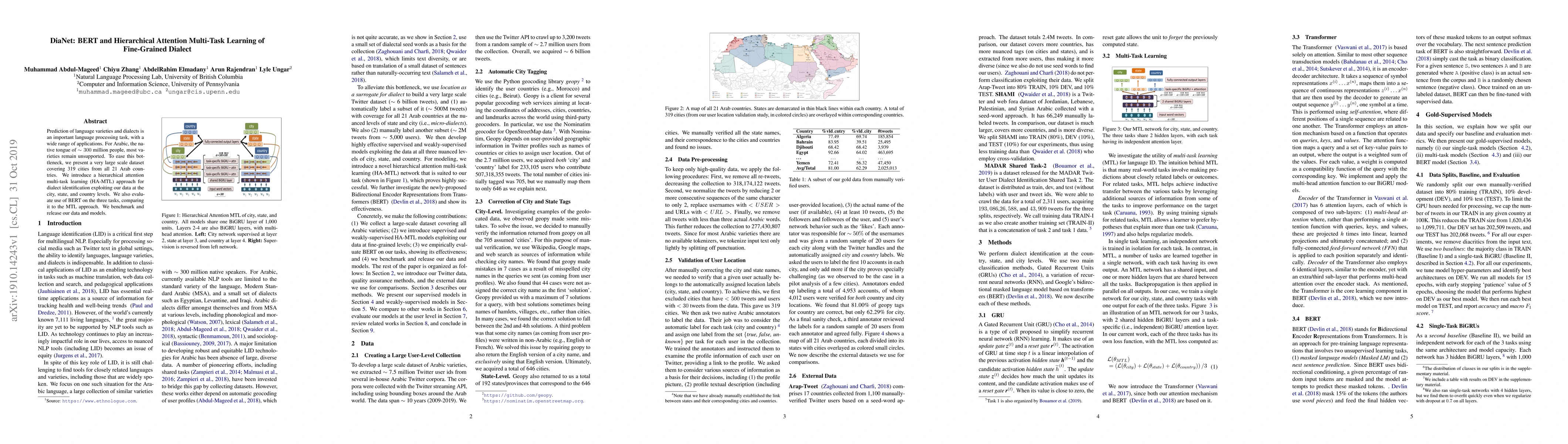The paper introduces DiaNet, a hierarchical attention multi-task learning approach for fine-grained dialect identification in Arabic, leveraging a large dataset from 319 cities across 21 Arab countries. It also evaluates BERT's performance against this approach and releases the dataset and models for further research.